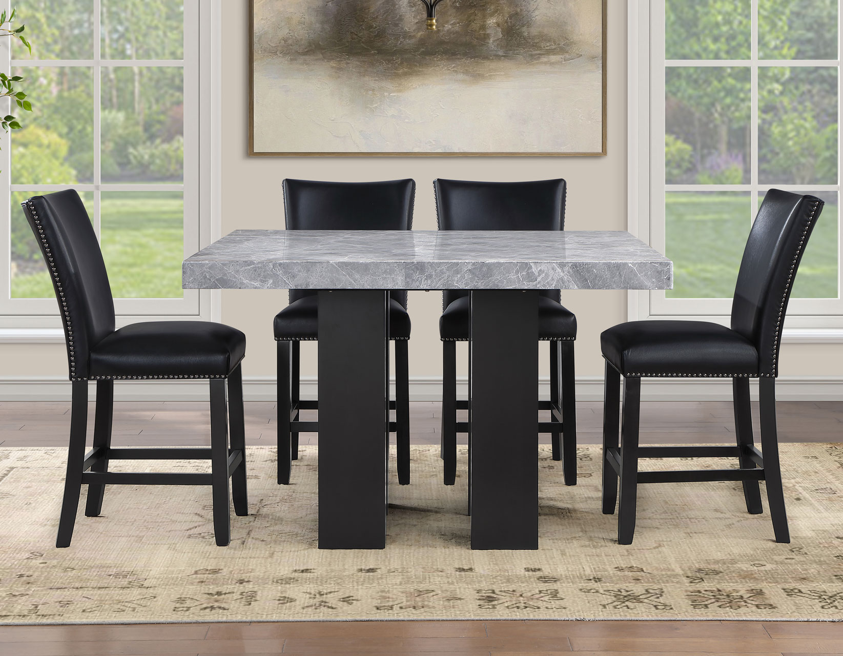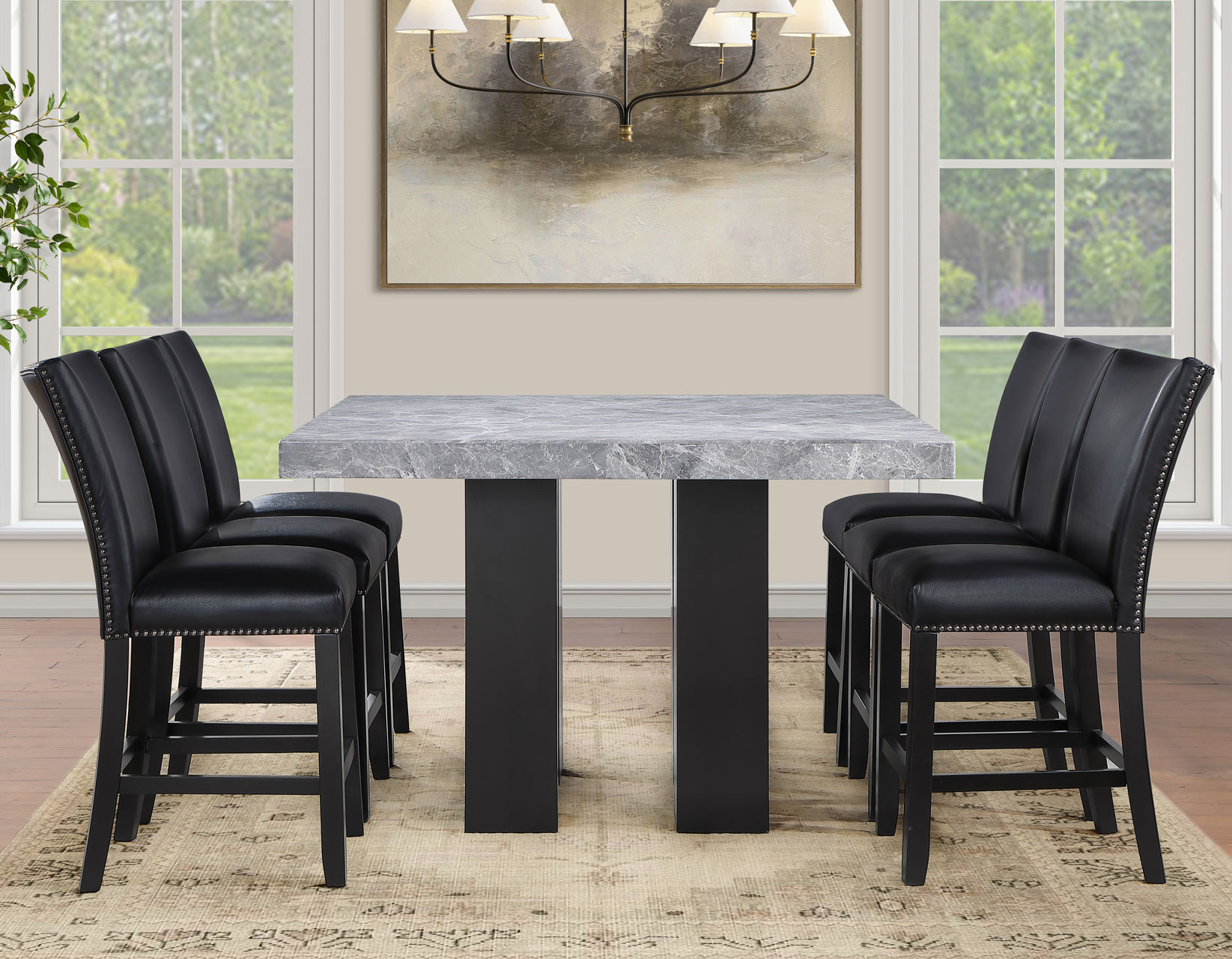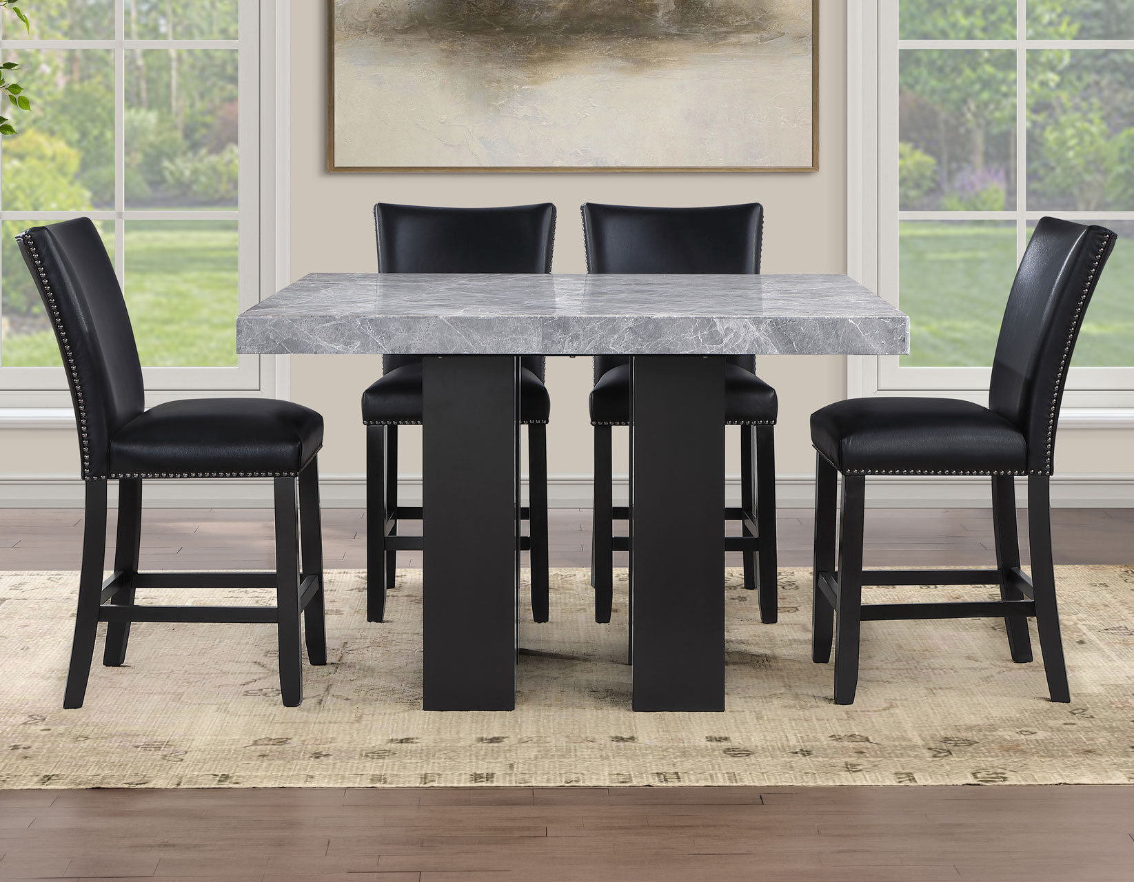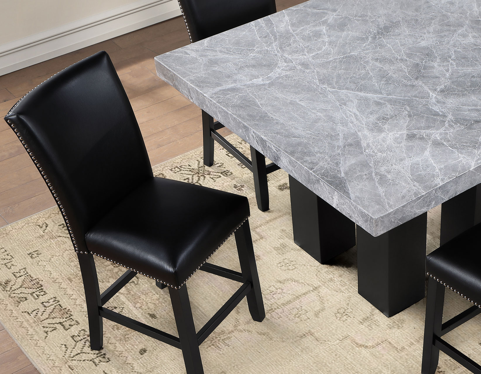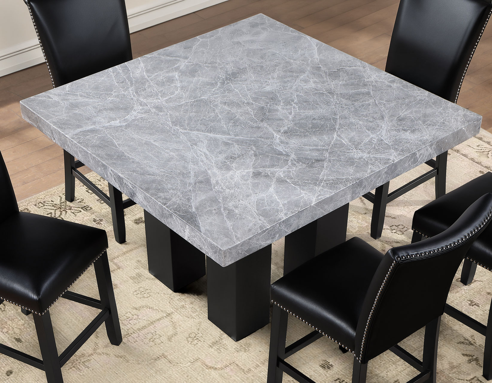 Sleek, sophisticated, and modern, the Artemis 54″ Gray 5-piece counter set delivers standout style and everyday function. The 54-inch square gray marble table seats up to eight while keeping conversation close and inviting. A substantial 3″ marble-look top and bold black base create a high-end presence. Four black vegan leather counter chairs, accented with silver nailhead trim, add crisp contrast and tailored appeal, while supportive seating and sturdy construction ensure lasting comfort, durability, and performance for dining and entertaining alike.