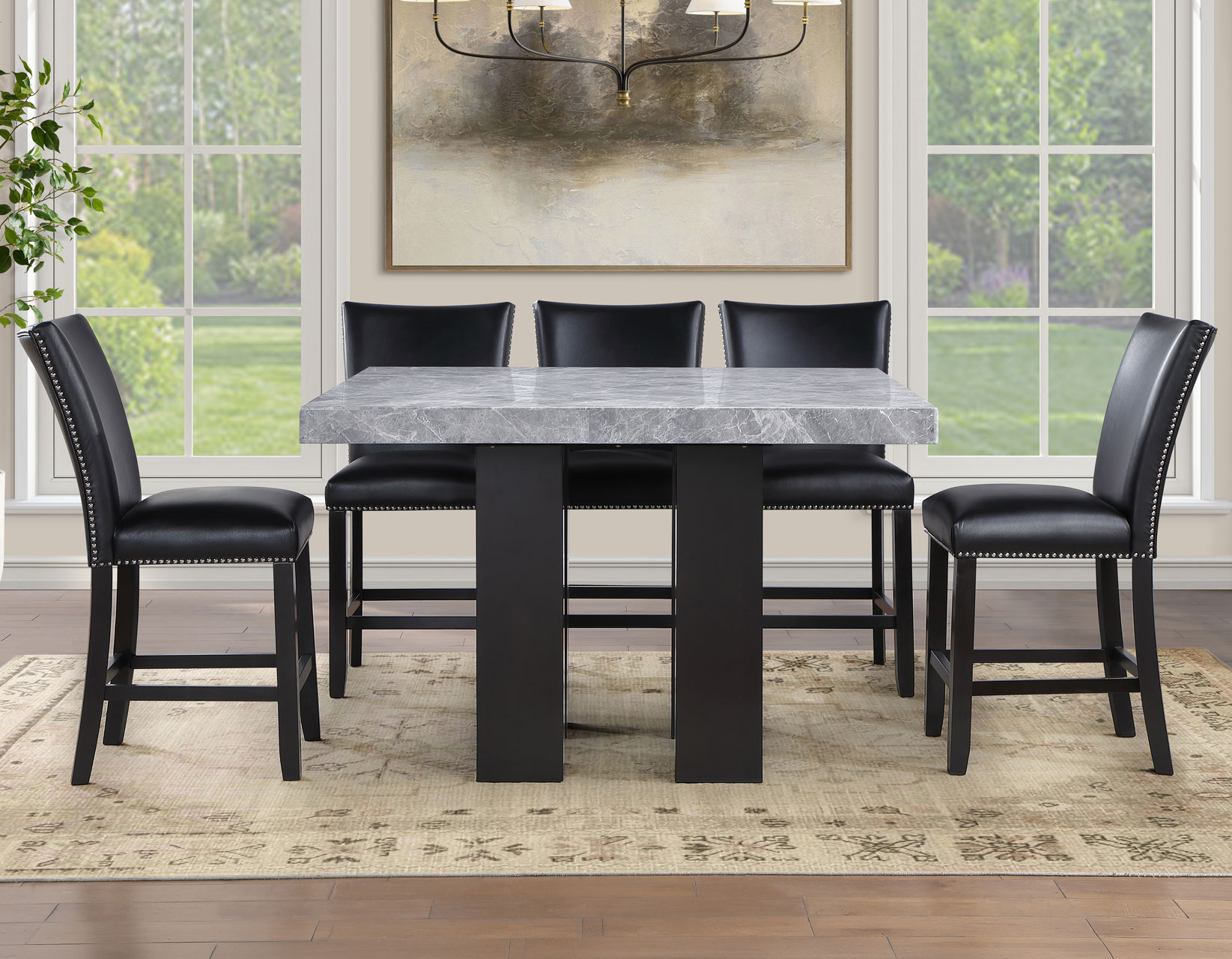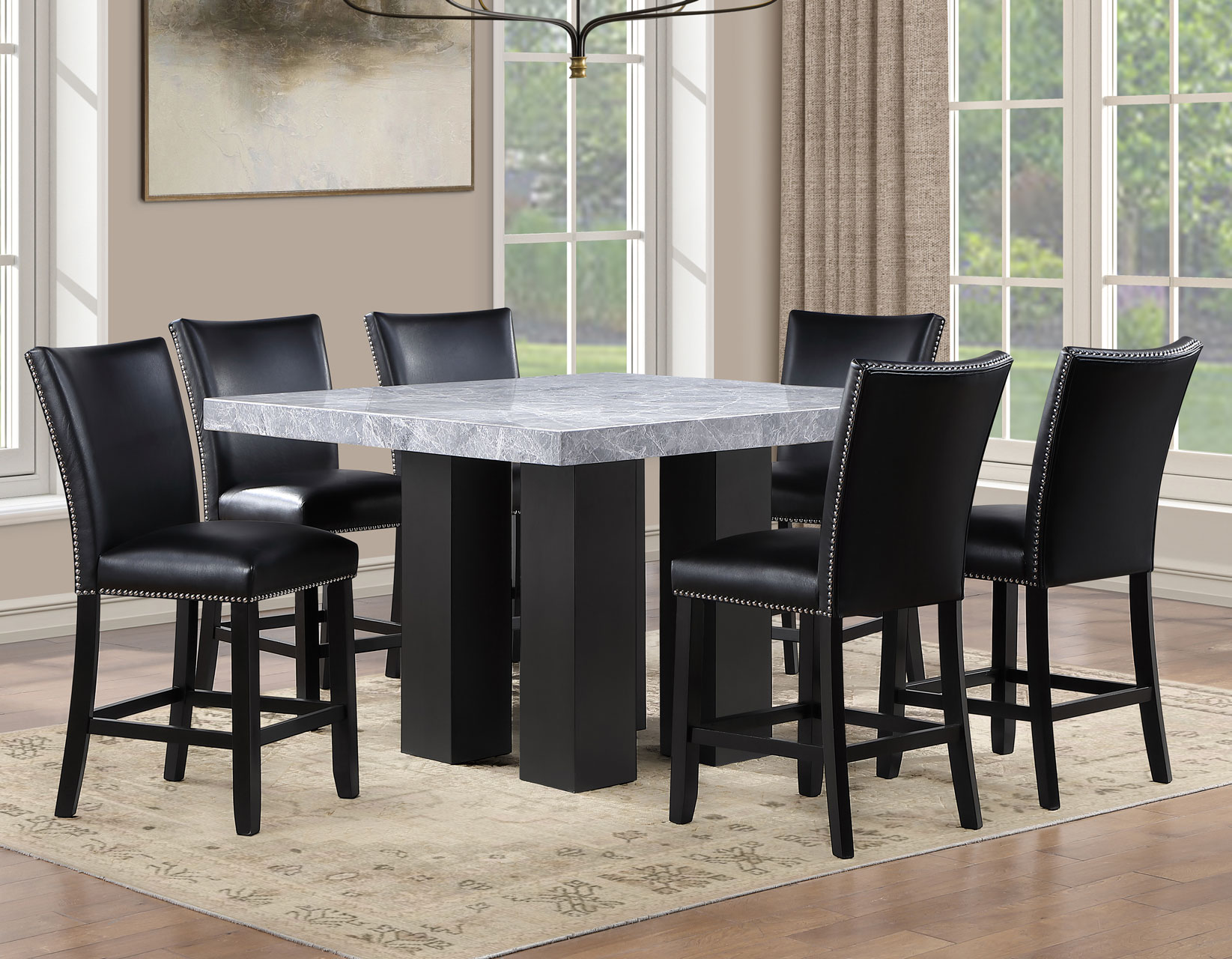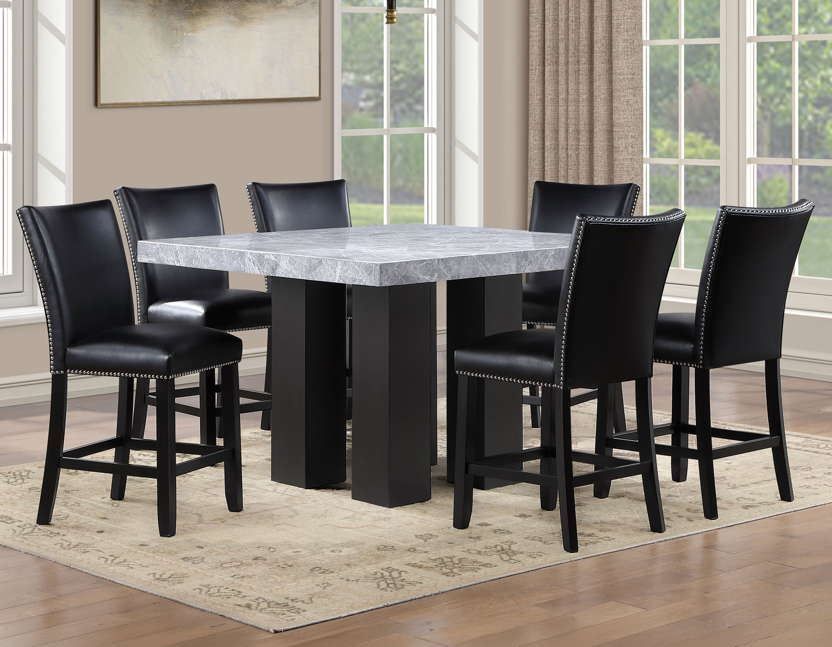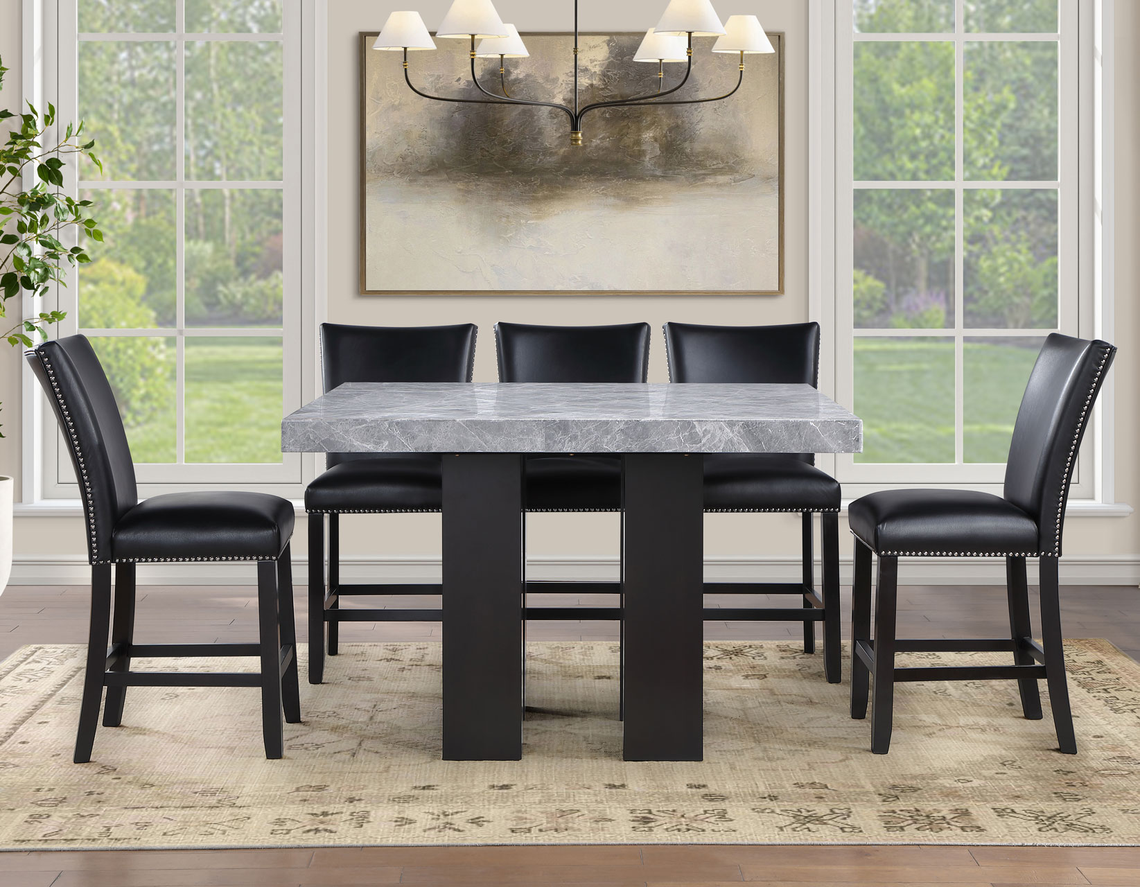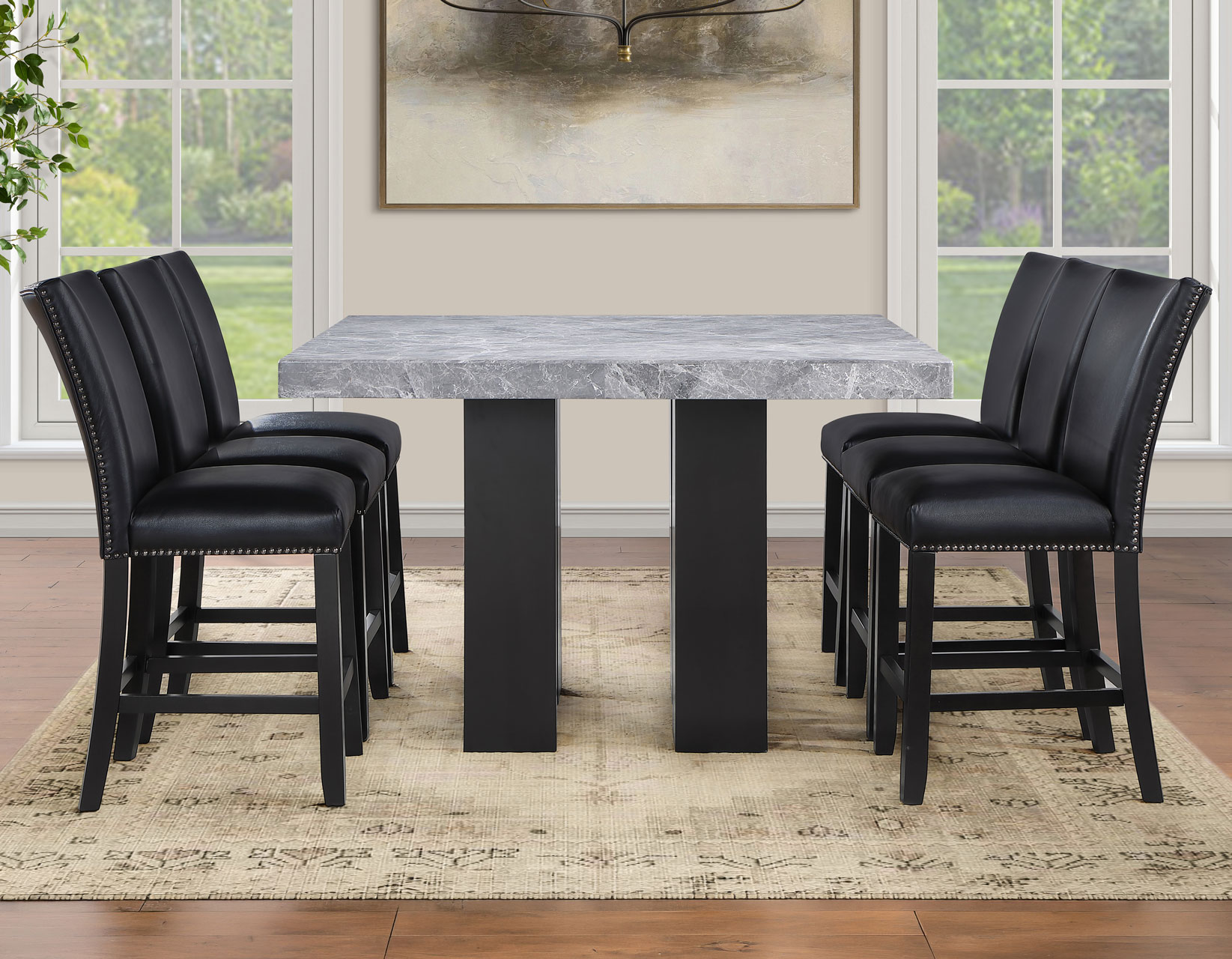 Sleek, sophisticated, and modern, the Artemis 54″ Gray 5-piece counter set delivers standout style and everyday function. The 54-inch square gray marble table seats up to eight while keeping conversation close and inviting. A substantial 3″ marble-look top and bold black base create a high-end presence. Four black vegan leather counter chairs, accented with silver nailhead trim, add crisp contrast and tailored appeal, while supportive seating and sturdy construction ensure lasting comfort, durability, and performance for dining and entertaining alike.