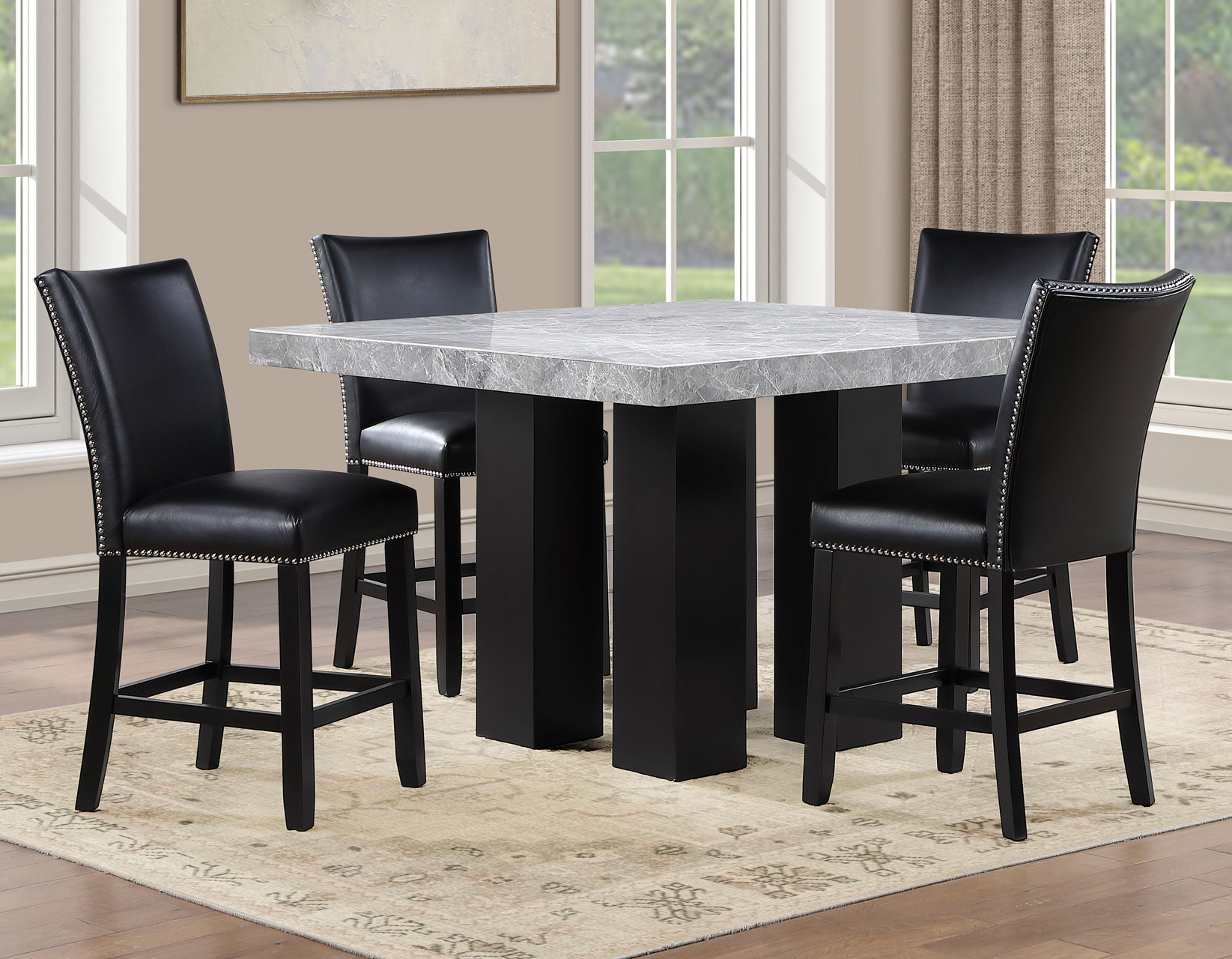 - 5-piece set includes the Artemis 54″ Square Gray Marble Counter Table and 4 Artemis Black Vegan Leather Counter Chairs. Each item also sold separately.