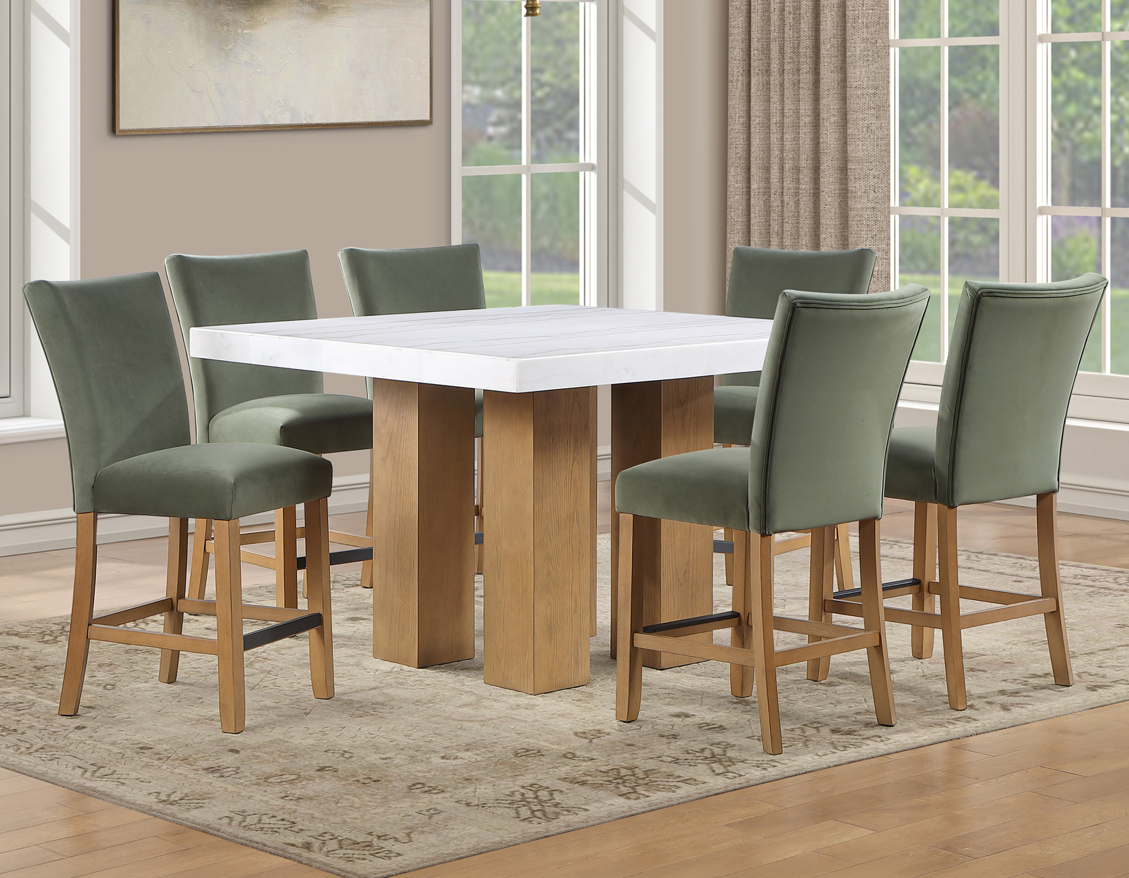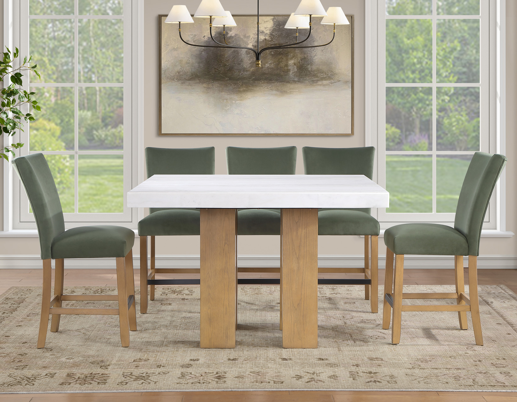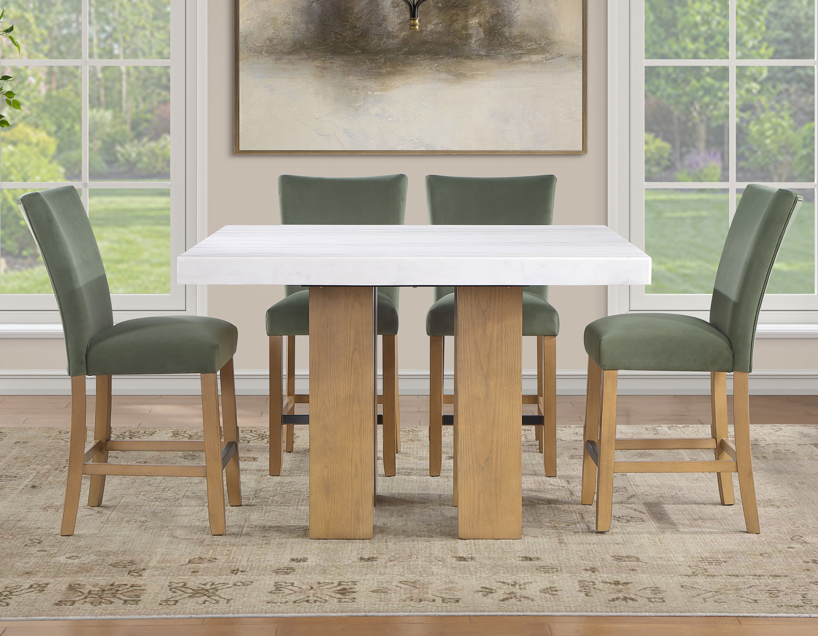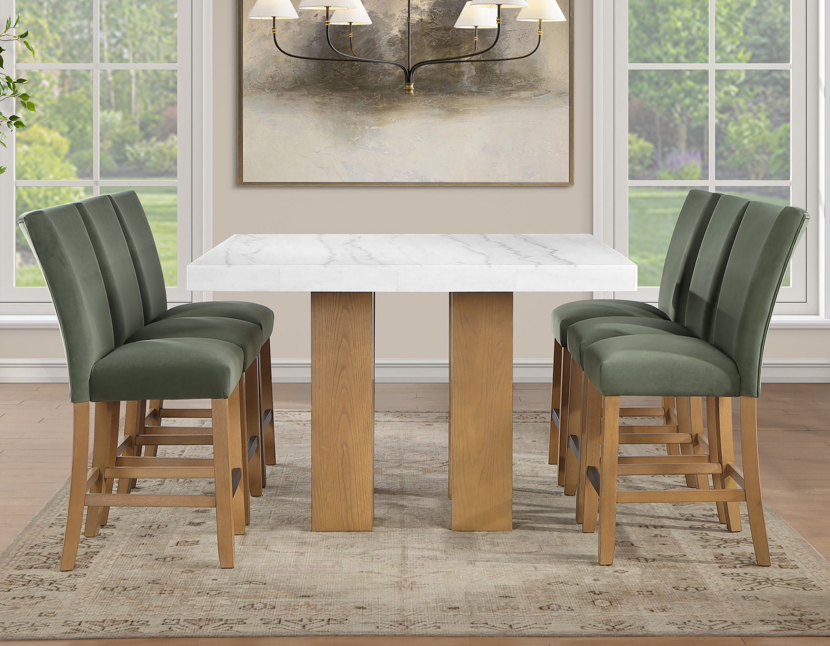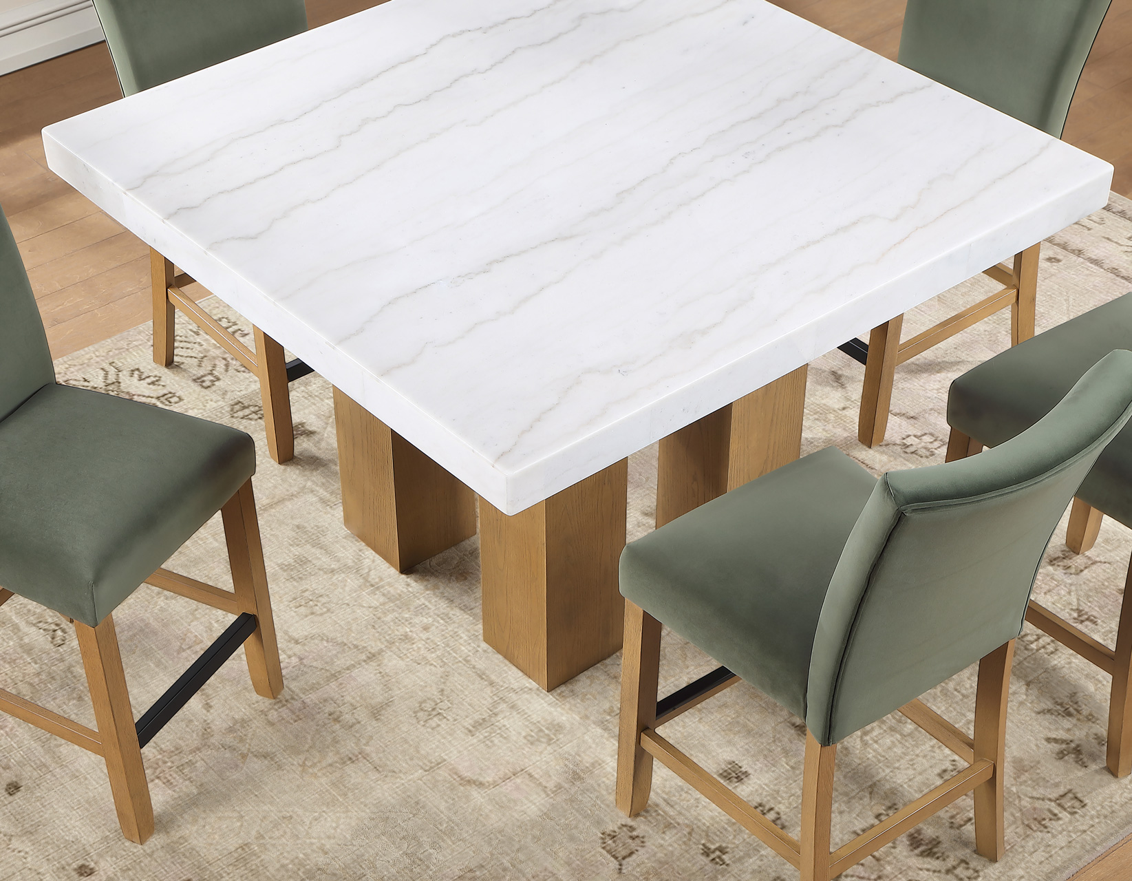 Meet the Artemis 54-inch square marble counter set—where modern design feels easy and inviting. The double pedestal base brings bold architectural style, while the casual sand finish keeps the look relaxed and livable. A sleek white marble top adds just the right touch of elegance. Paired with plush green velvet counter chairs, each designed with a perfect pitch for a comfortable seat, it’s made for gathering. At a comfortable 36″ height, it offers easy entry, lasting durability, and effortless everyday style.