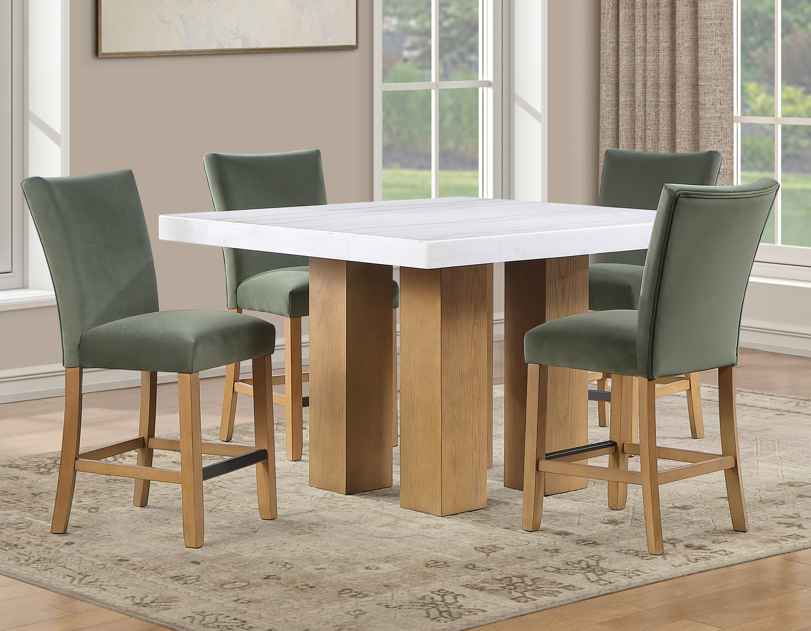 Artemis 5-Piece 54″ Square White Marble Counter Table, Sand Finish w/4 Green Velvet Counter Chairs