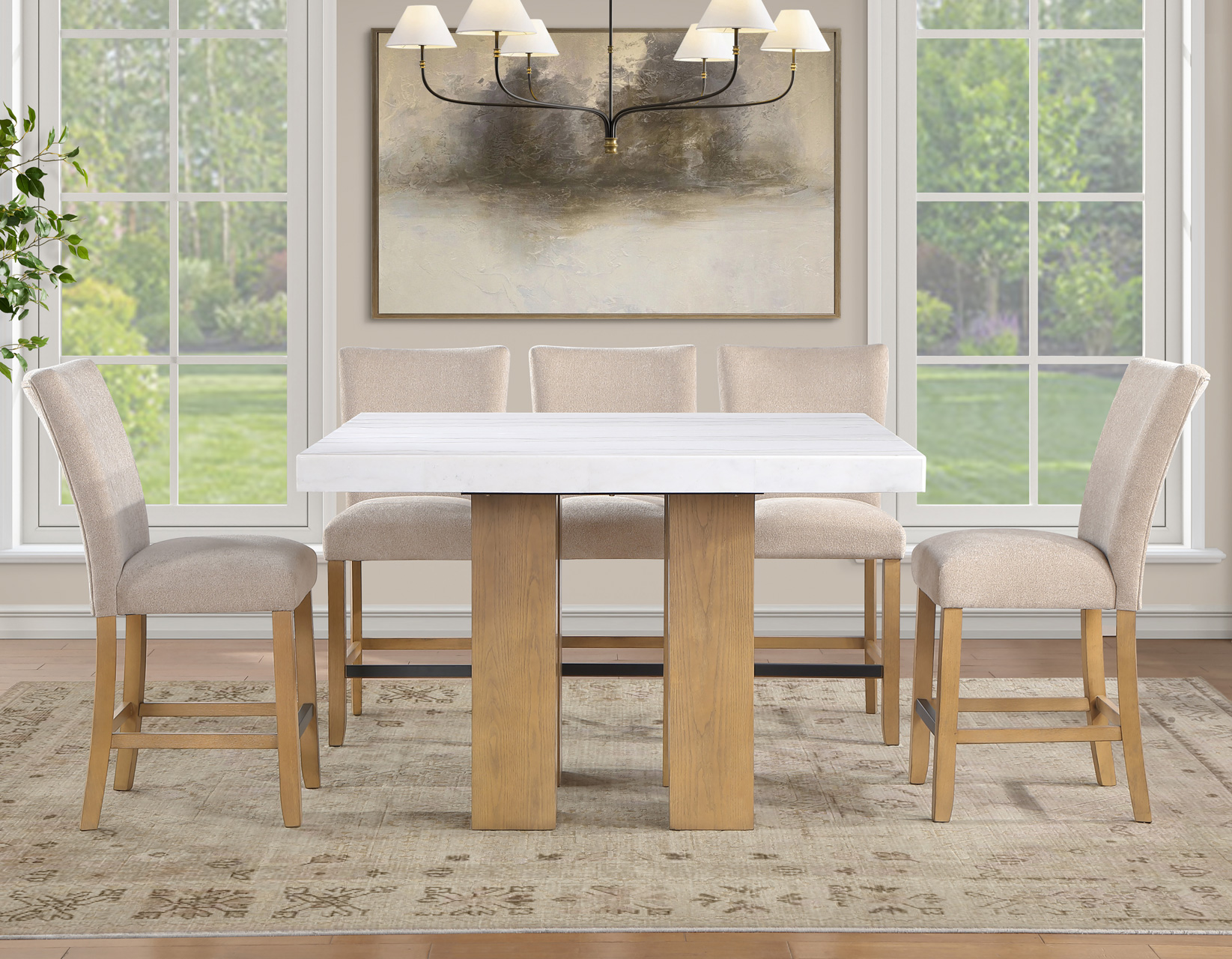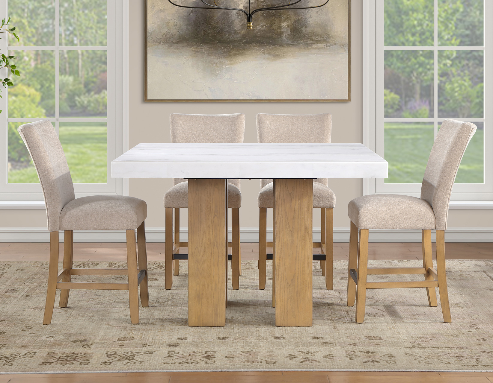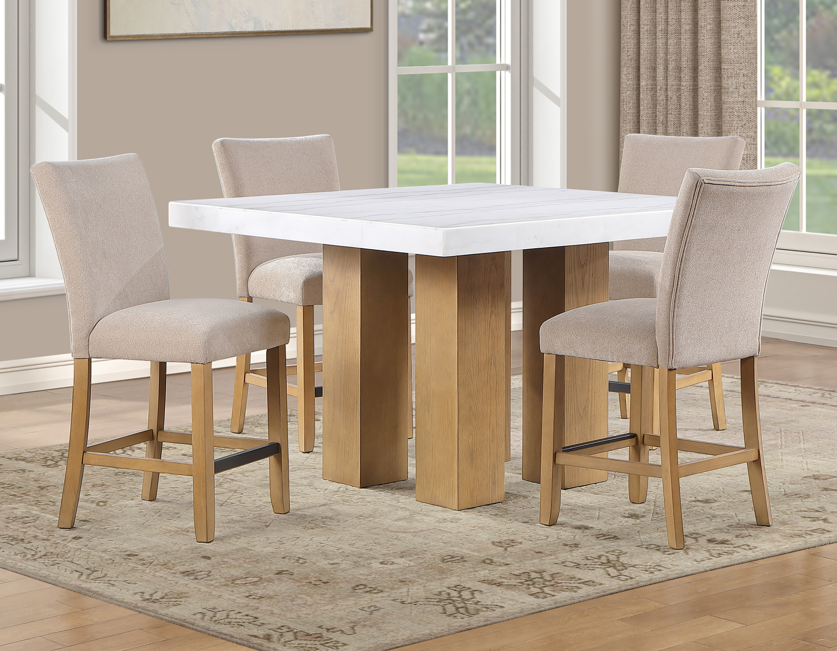 Artemis 5 Piece 54″ Square White Marble Counter Table, Tan Finish w/4 Beige Chenille Counter Chairs