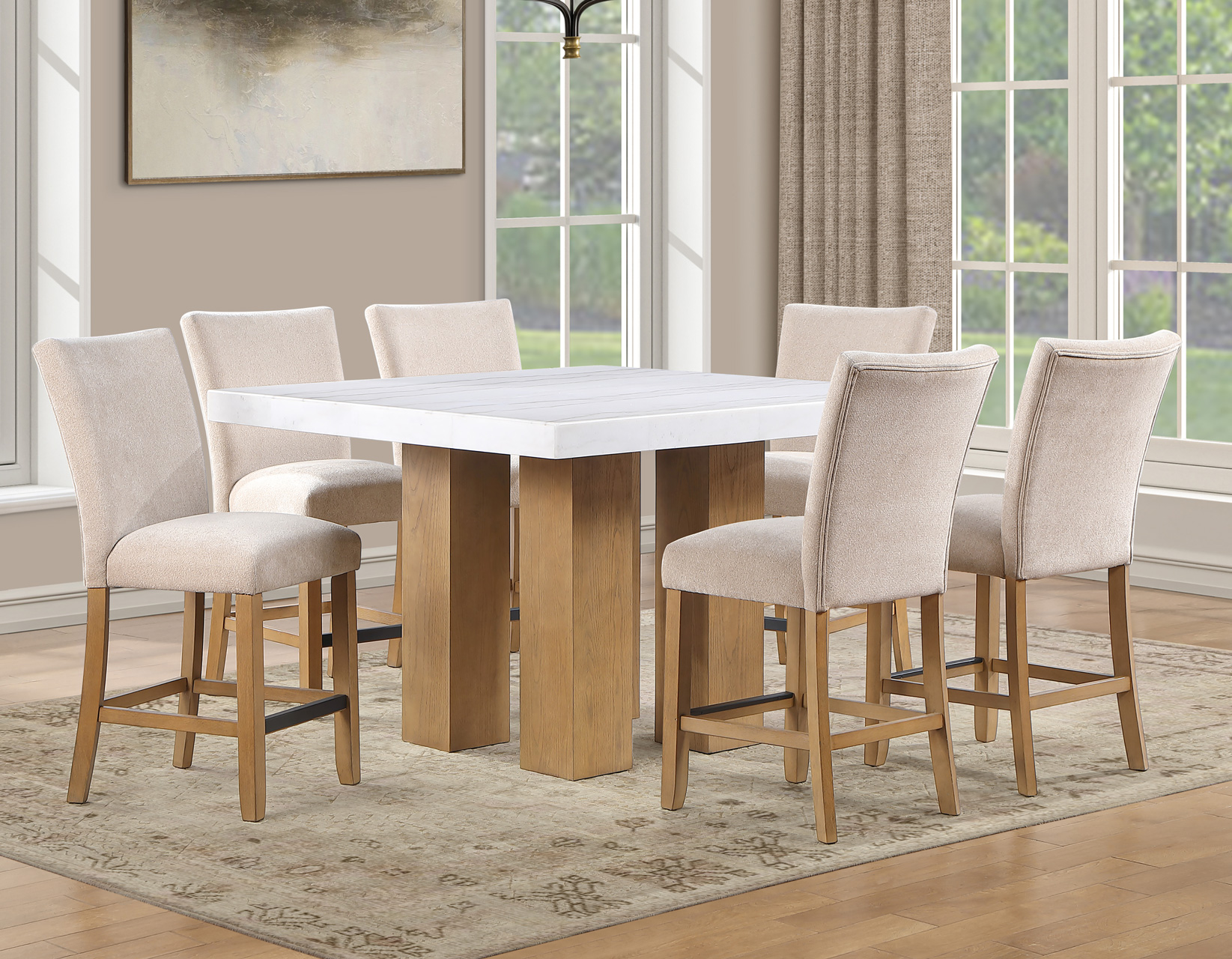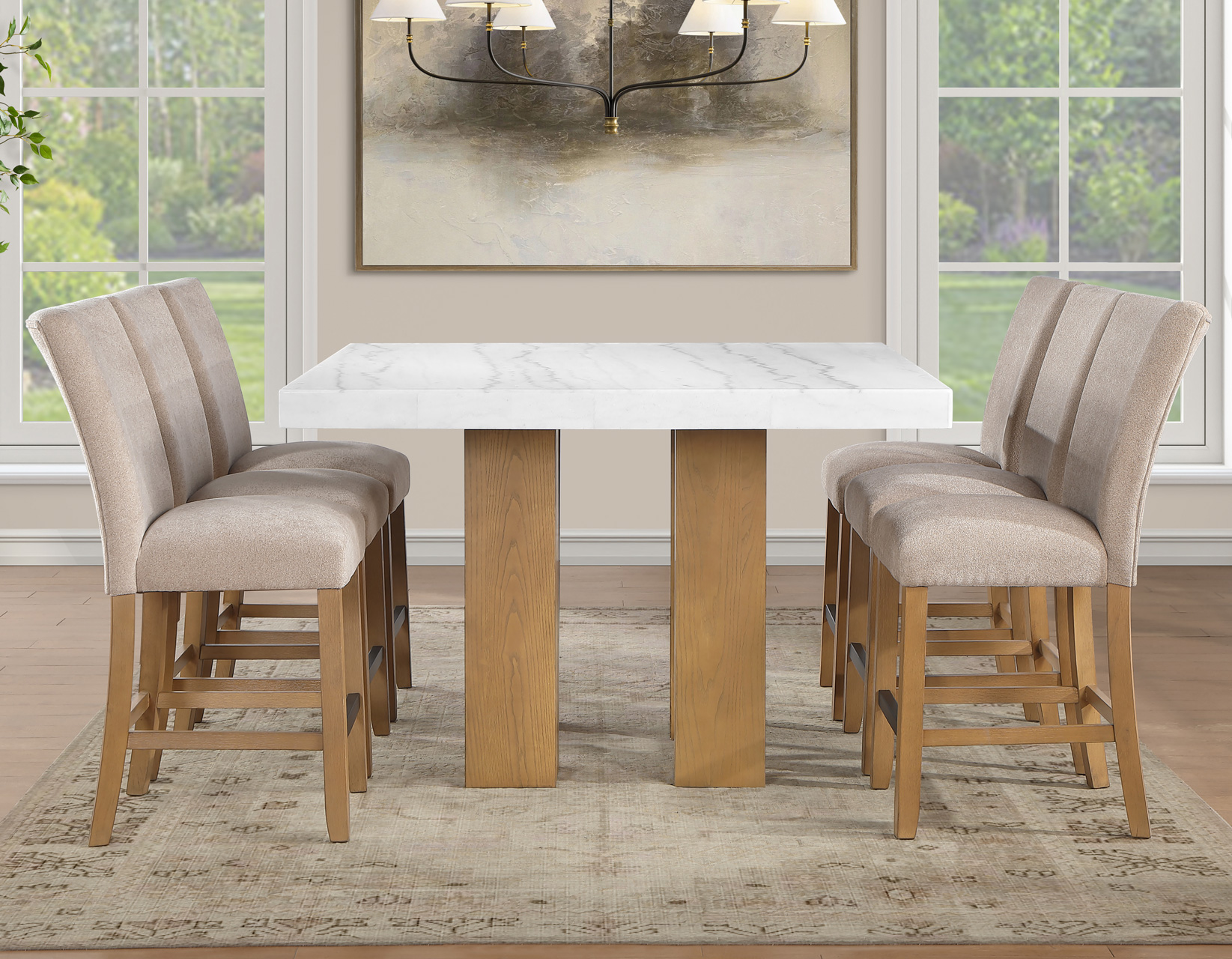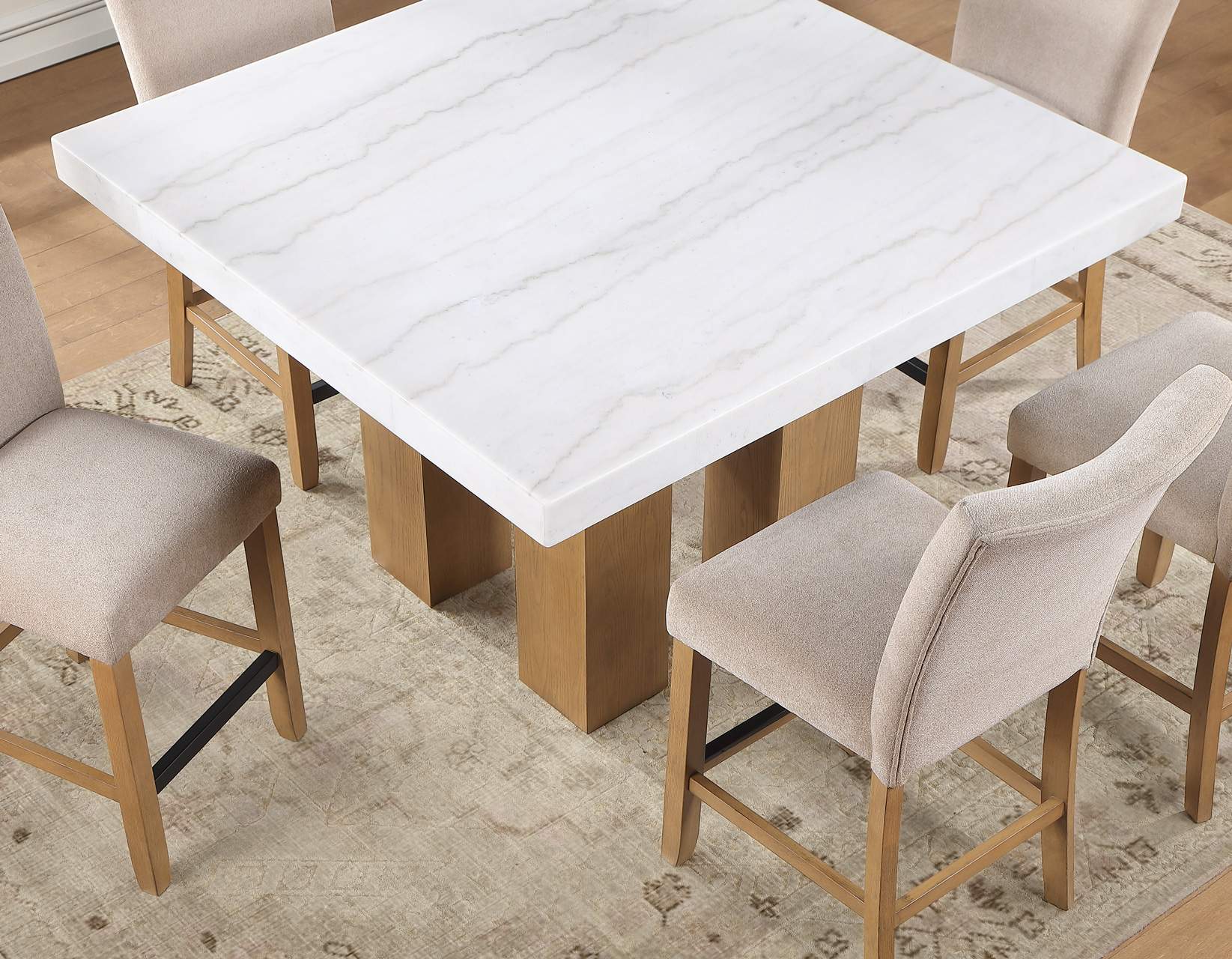 Sleek, sophisticated, and modern, the Artemis 54″ white marble 5-piece counter set delivers standout style with everyday versatility. The 54-inch square table seats up to eight while keeping conversation close and inviting. A substantial white marble top is beautifully softened by a sand finish double pedestal base for a relaxed yet elegant presentation. At a comfortable 36″ height, it’s perfect for dining, working, or gathering with easy entry and exit. Four beige chenille counter chairs add plush comfort, making it ideal for both daily living and entertaining.