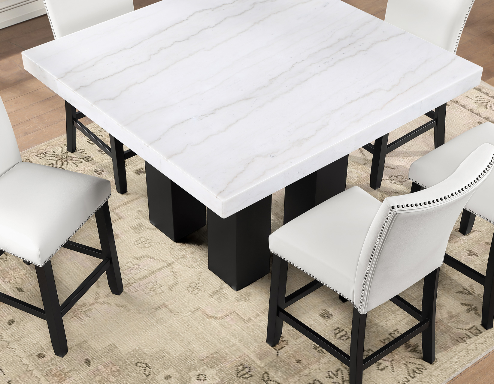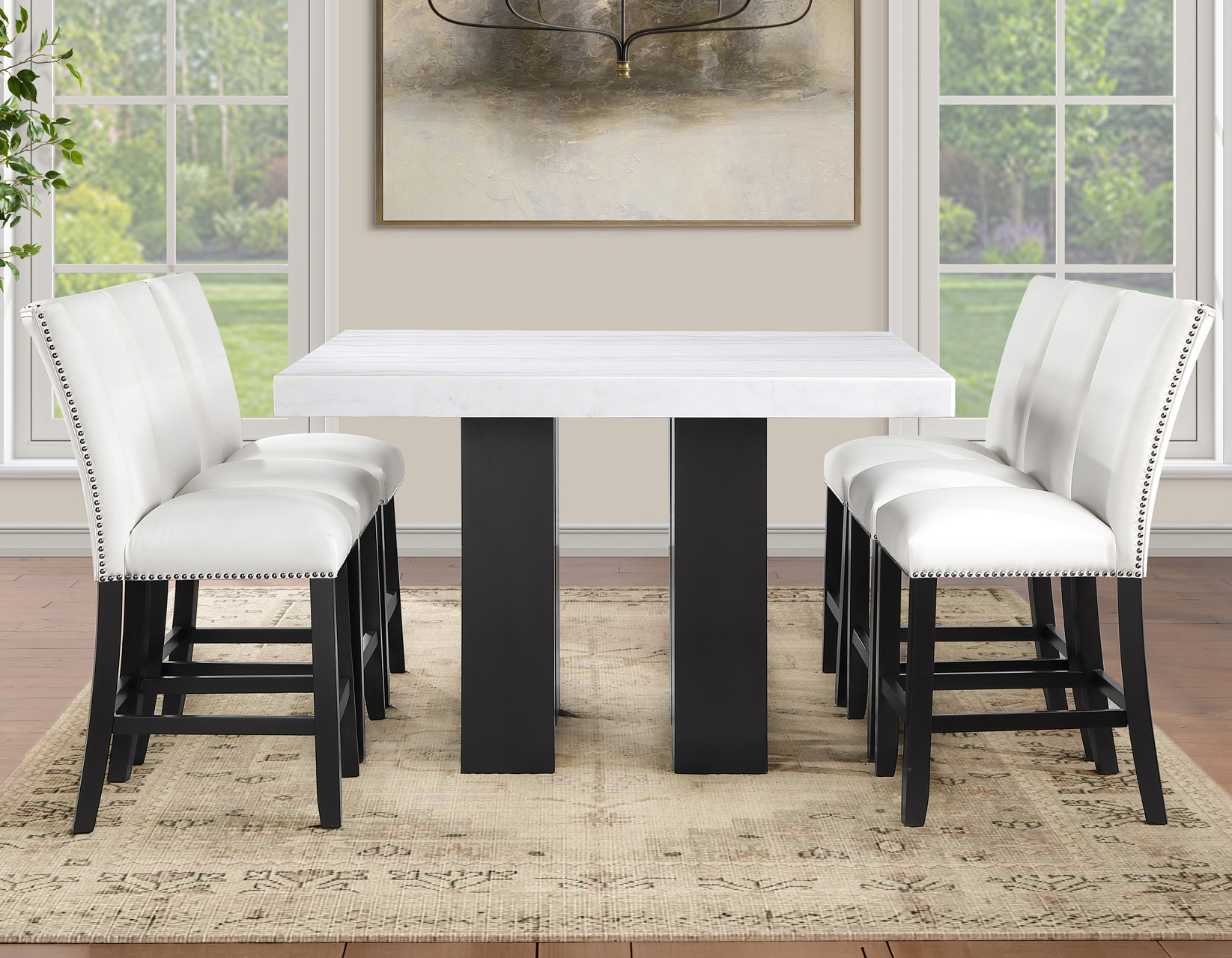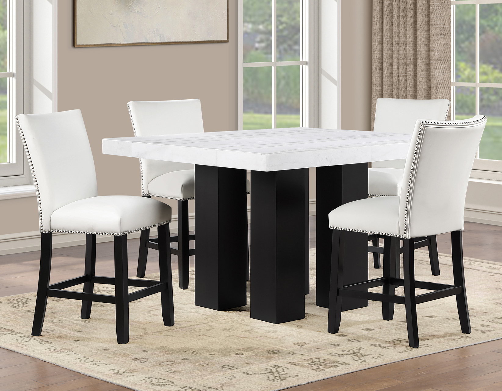 Sleek, sophisticated, and modern, the Artemis 54″ White Marble 5-piece counter set delivers standout style and everyday function. The 54-inch square white marble table comfortably seats up to eight while keeping conversation close and inviting. A substantial 3″ marble-look top and bold black base create a high-end presence. Four white vegan leather counter chairs, accented with silver nailhead trim, add crisp contrast and tailored appeal, while supportive seating and sturdy construction ensure lasting comfort, durability, and performance for dining and entertaining alike.