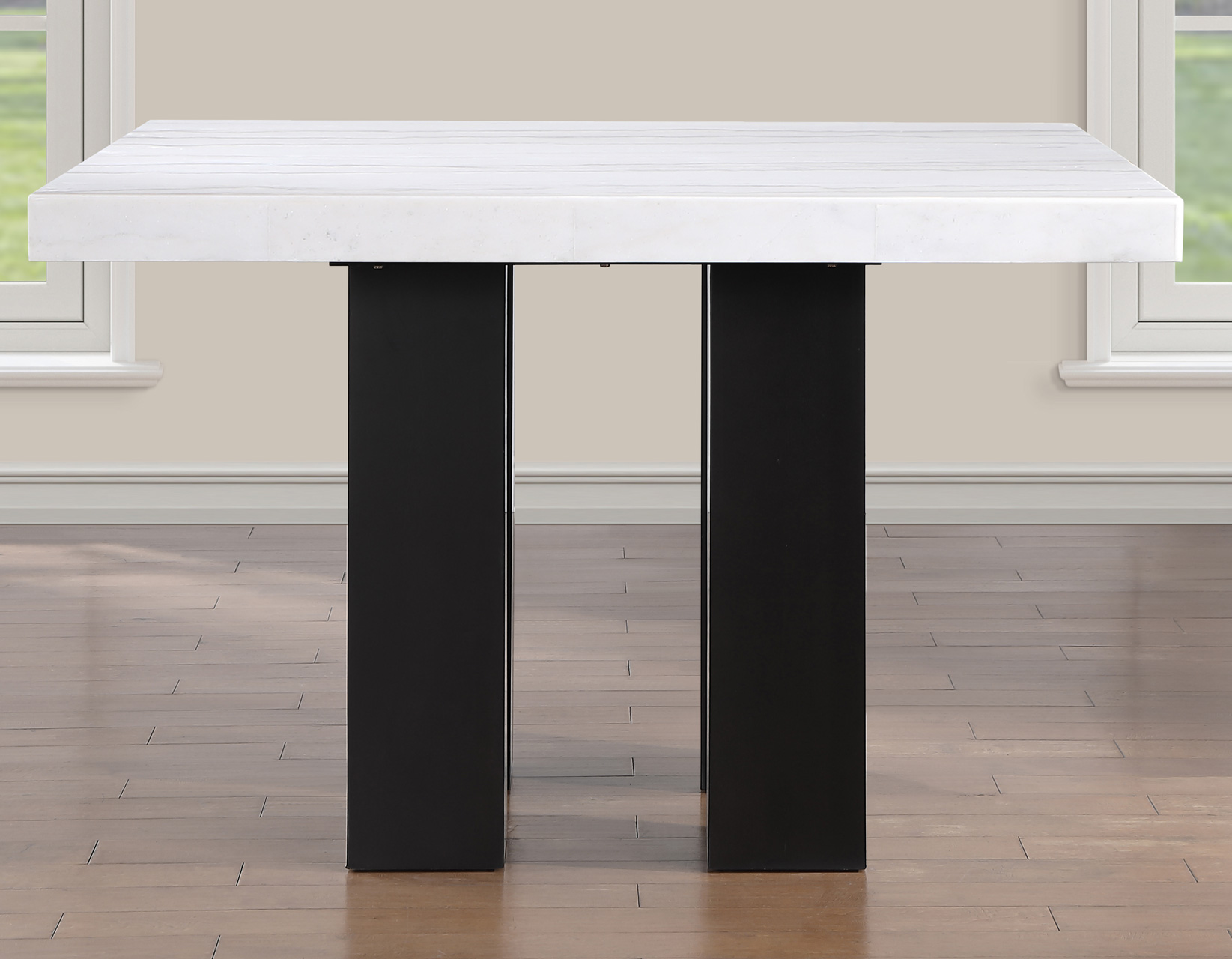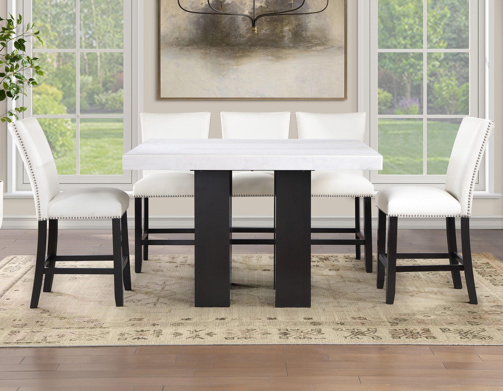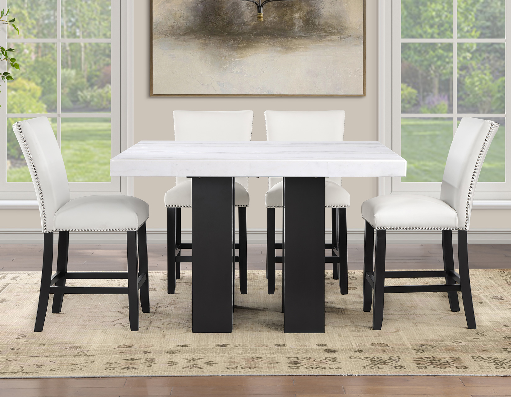 Sleek, sophisticated, and modern, the Artemis 54″ White Marble 5-piece counter set delivers standout style and everyday function. The 54-inch square white marble table comfortably seats up to eight while keeping conversation close and inviting. A substantial 3″ marble-look top and bold black base create a high-end presence. Four white vegan leather counter chairs, accented with silver nailhead trim, add crisp contrast and tailored appeal, while supportive seating and sturdy construction ensure lasting comfort, durability, and performance for dining and entertaining alike.