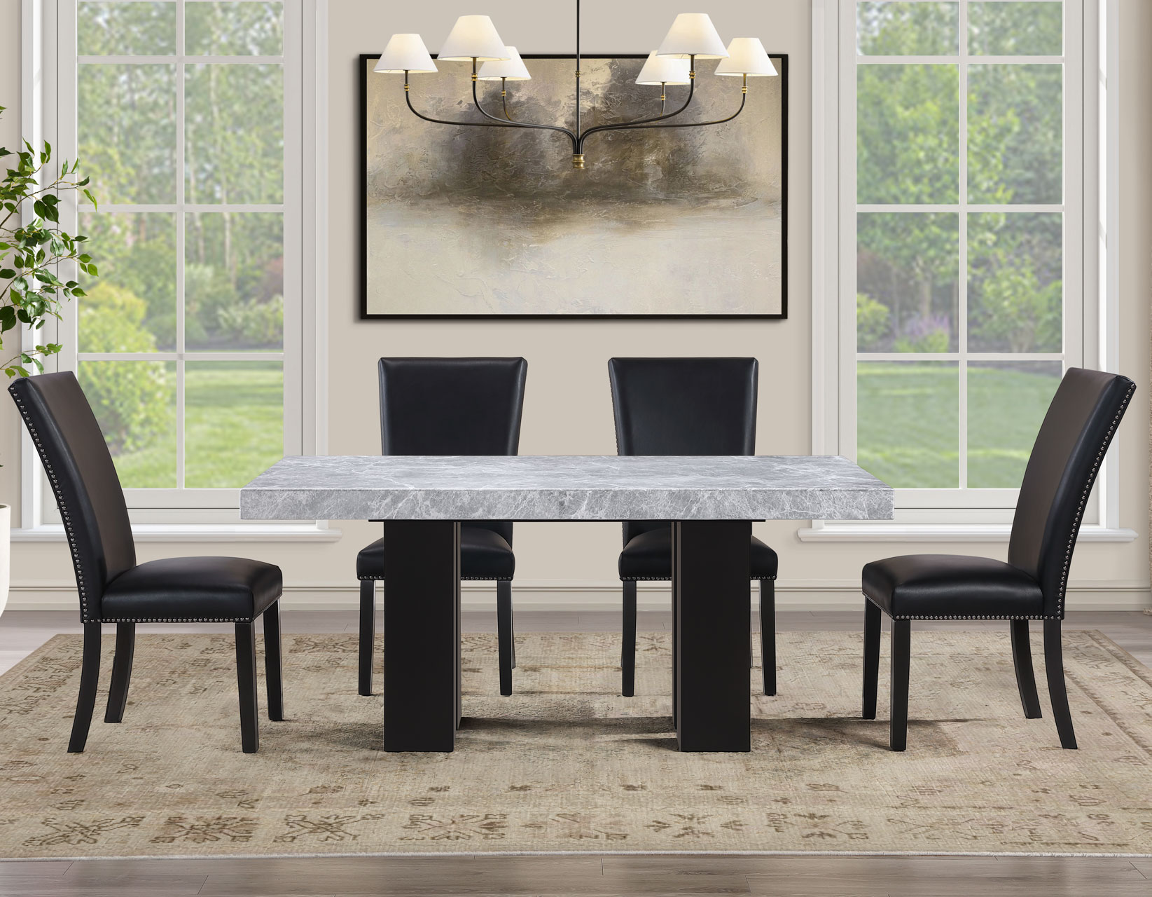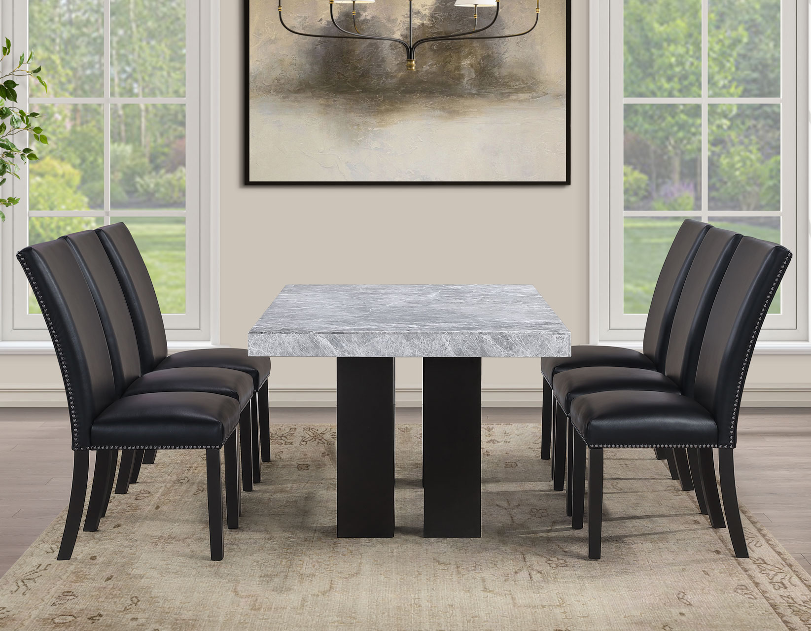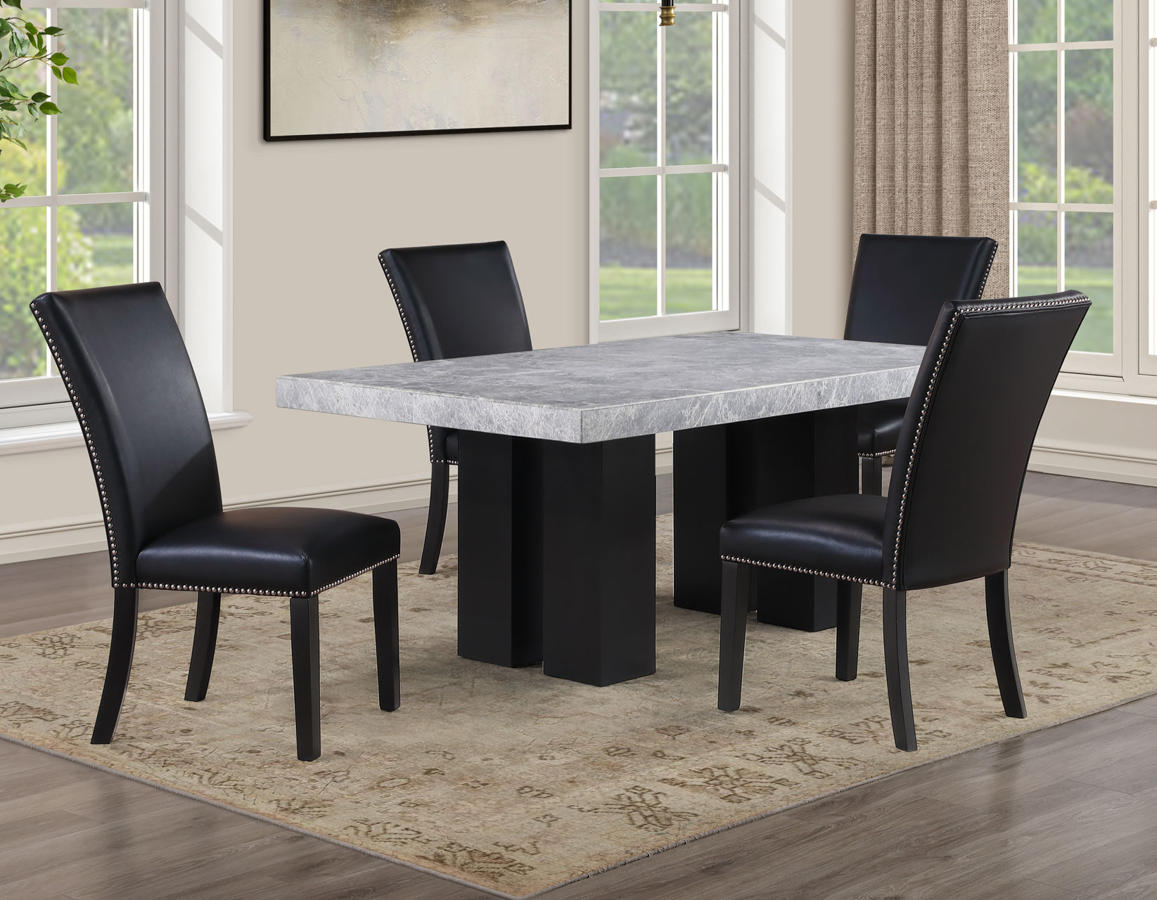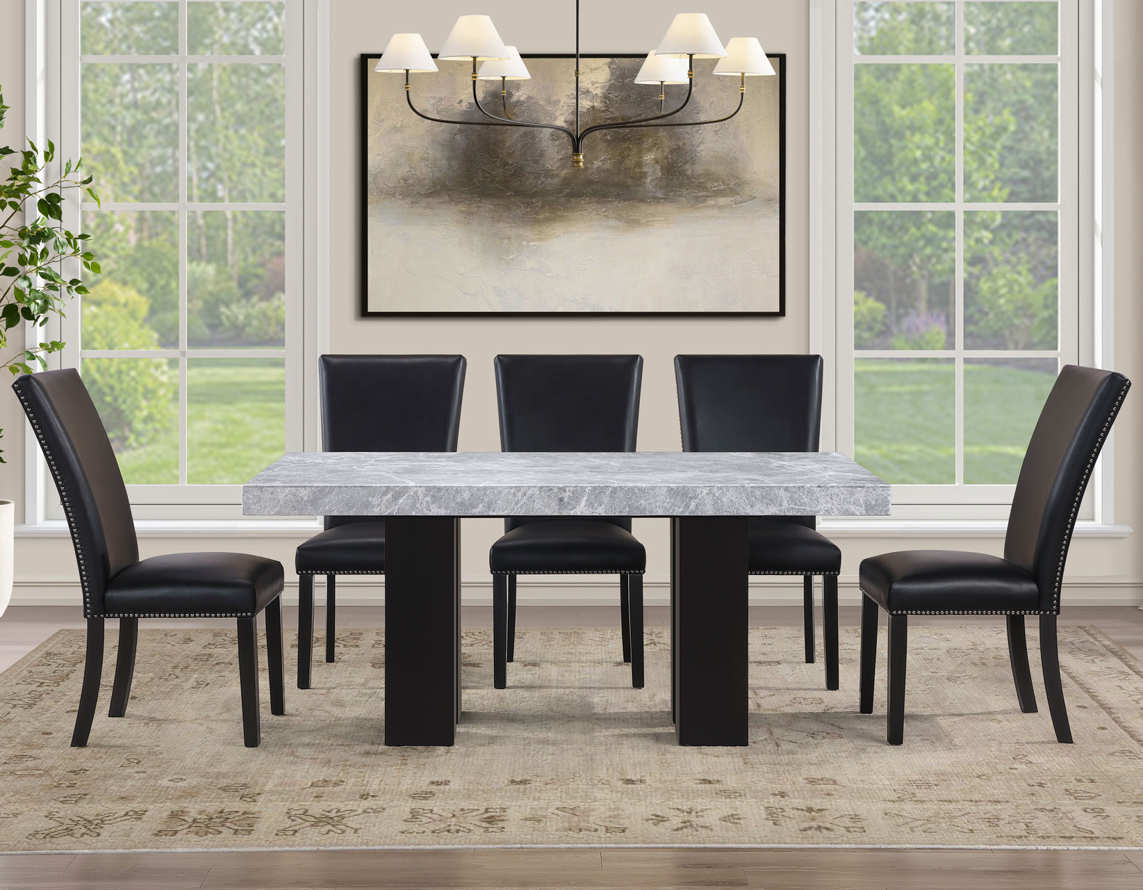 - 5-piece set includes the Artemis 70″ Gray Marble Dining Table, Black Finish and 4 Artemis Black Vegan Leather Side Chairs. Each item also sold separately.