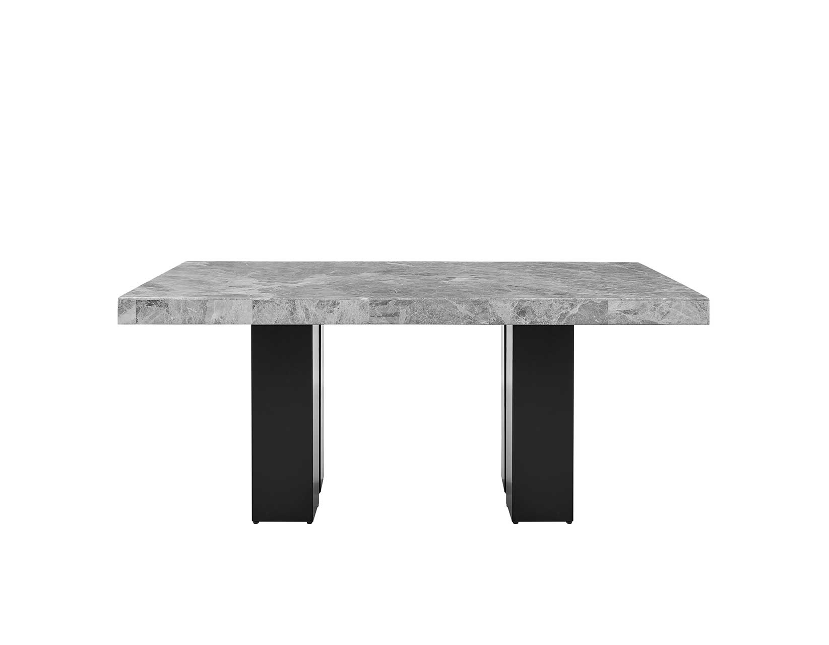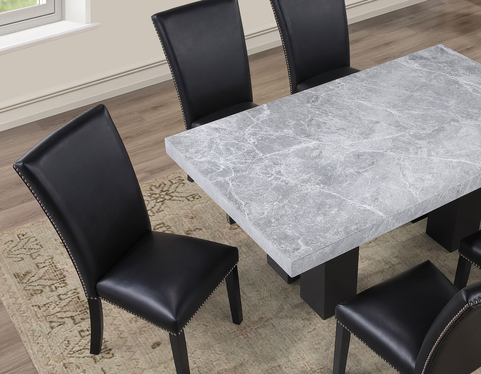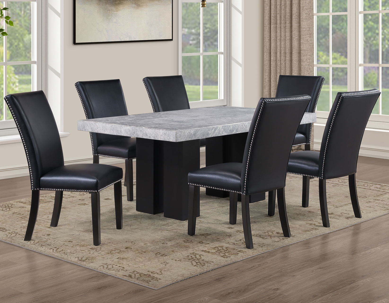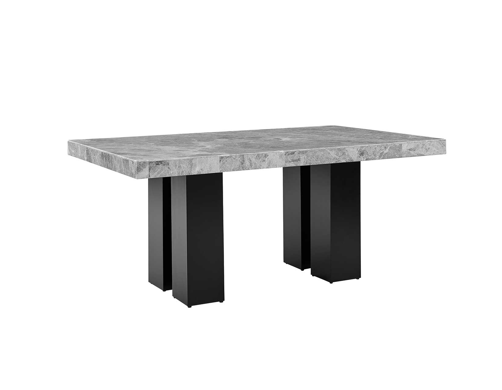 - 5-piece set includes the Artemis 70″ Gray Marble Dining Table, Black Finish and 4 Artemis Black Vegan Leather Side Chairs. Each item also sold separately.