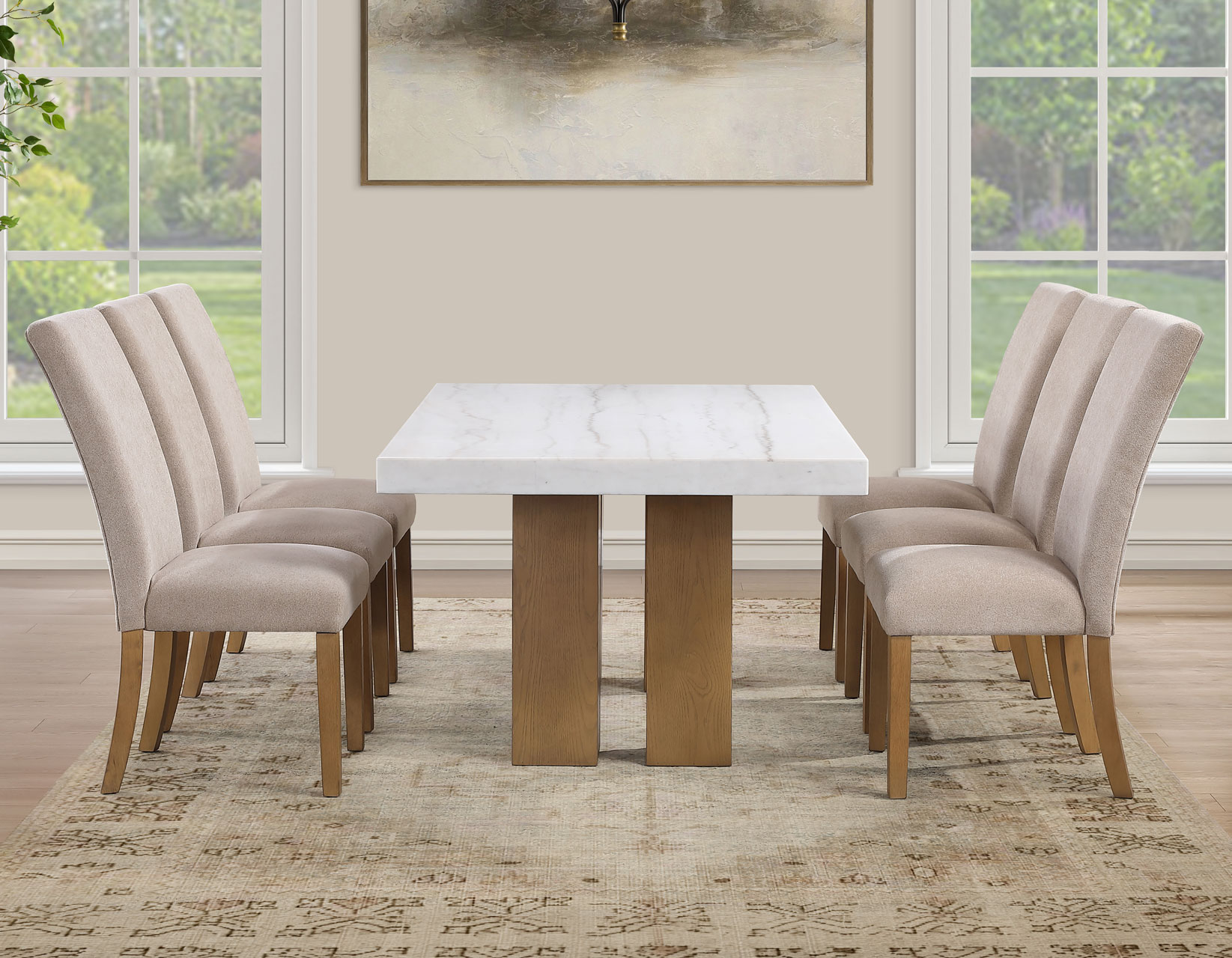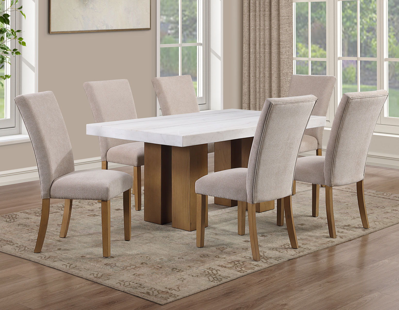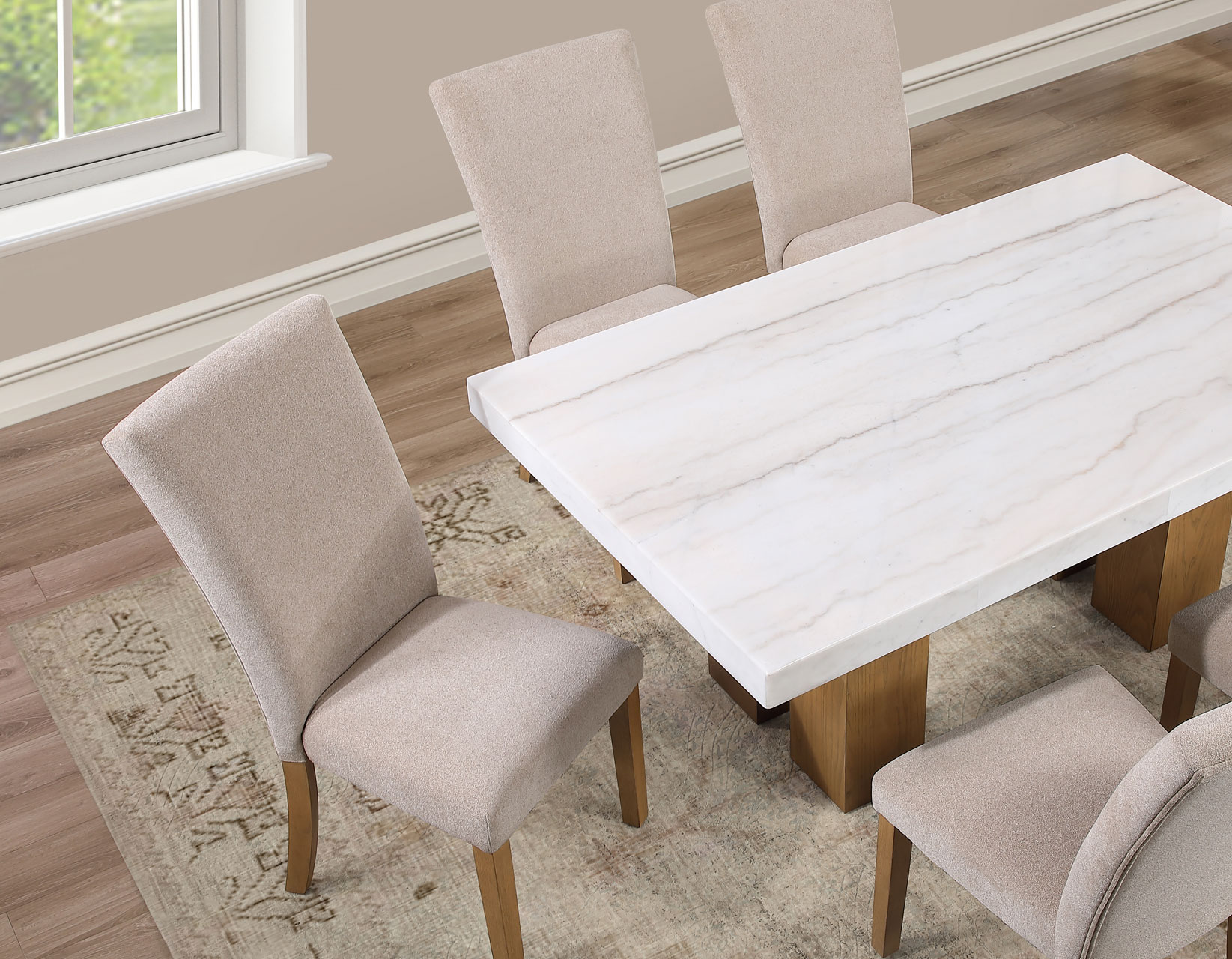 Meet the Artemis 70-inch marble top table—where modern design feels easy and inviting. The architectural base brings bold style, while the casual sand finish keeps the look relaxed and livable. A sleek white marble top adds just the right touch of elegance. Paired with soft beige chenille chairs, each designed with a perfect pitch for a comfortable seat, it’s made for gathering. With solid wood legs and screwed corner joints, this set delivers the durability you need with the style you want.