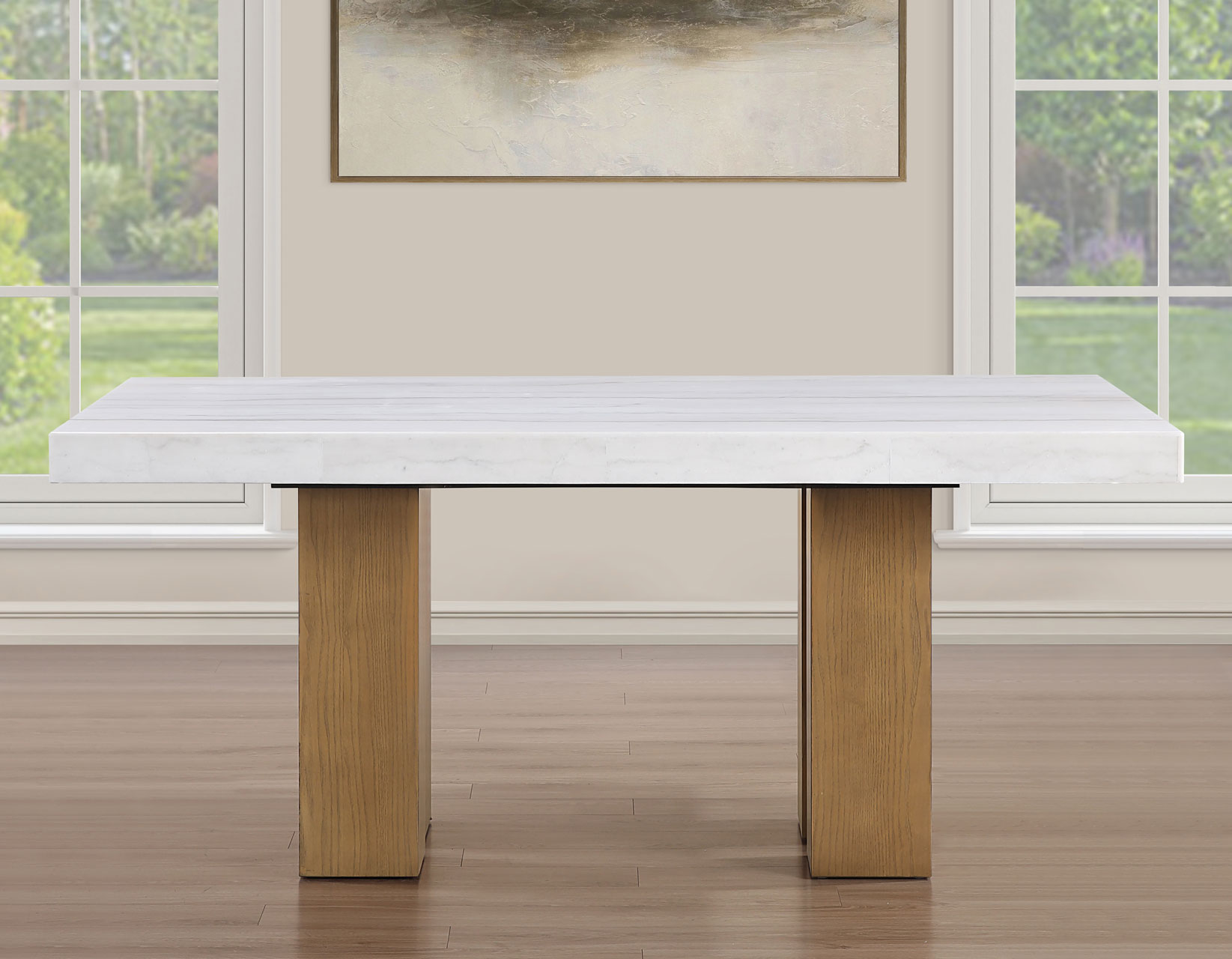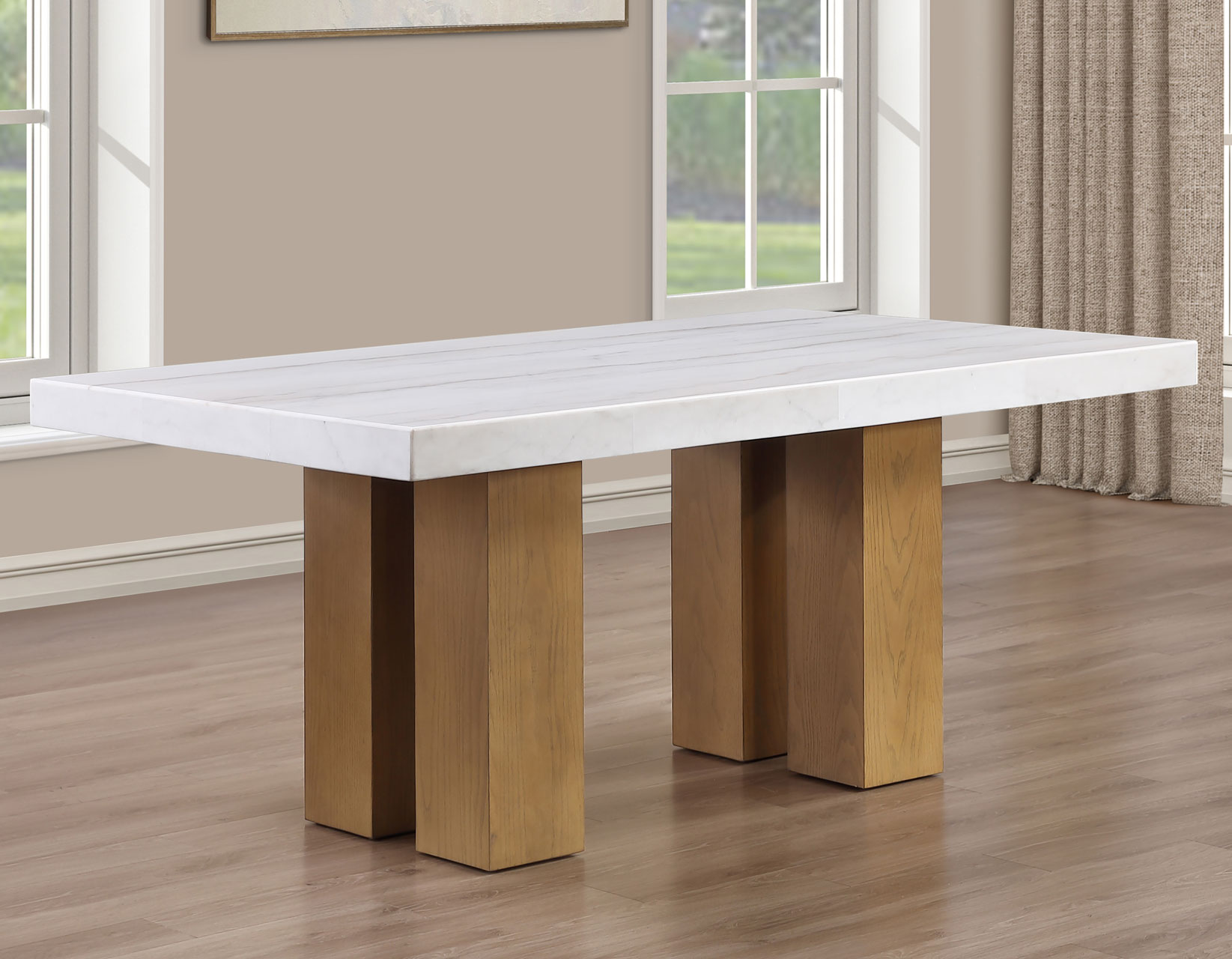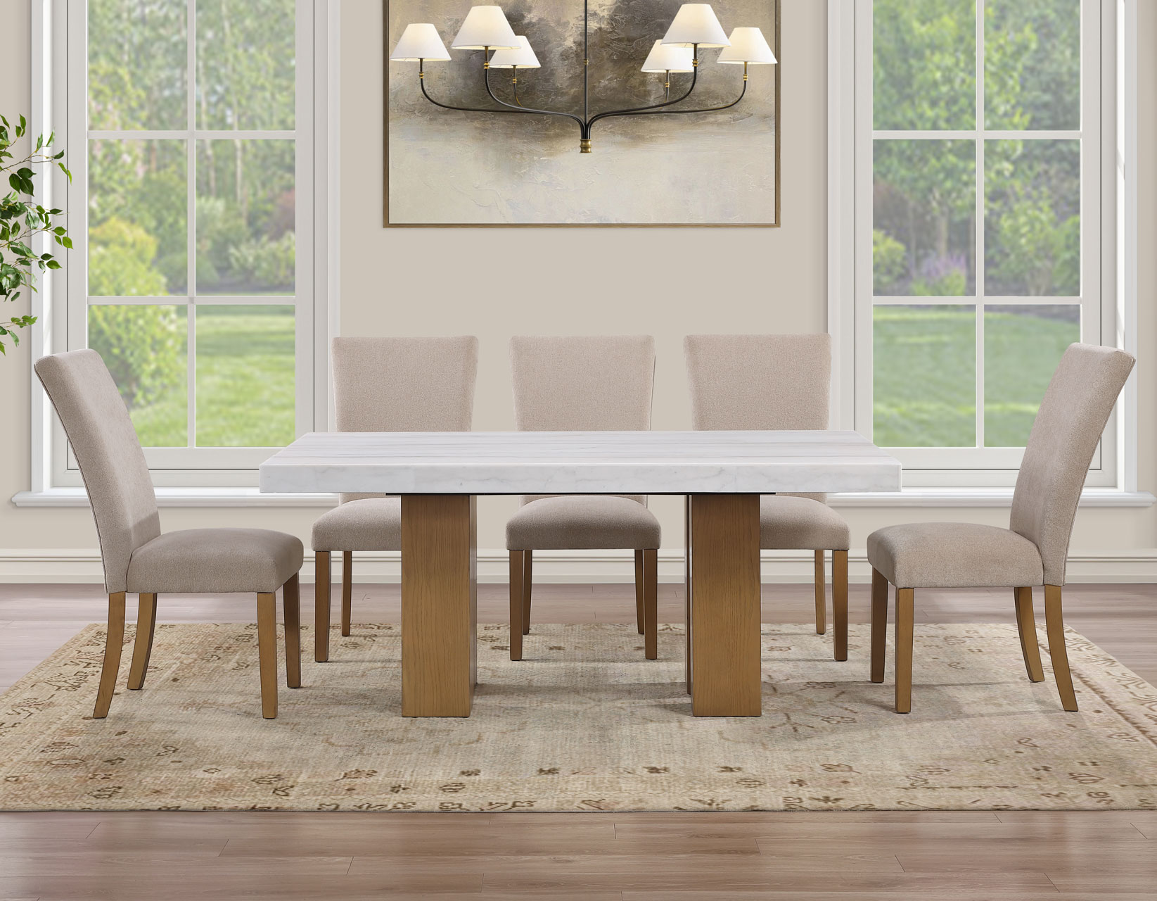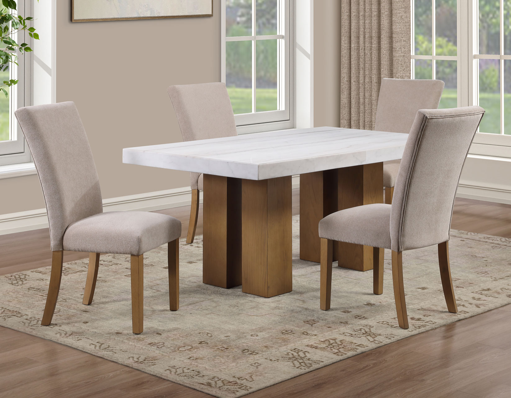 Meet the Artemis 70-inch marble top table—where modern design feels easy and inviting. The architectural base brings bold style, while the casual sand finish keeps the look relaxed and livable. A sleek white marble top adds just the right touch of elegance. Paired with soft beige chenille chairs, each designed with a perfect pitch for a comfortable seat, it’s made for gathering. With solid wood legs and screwed corner joints, this set delivers the durability you need with the style you want.