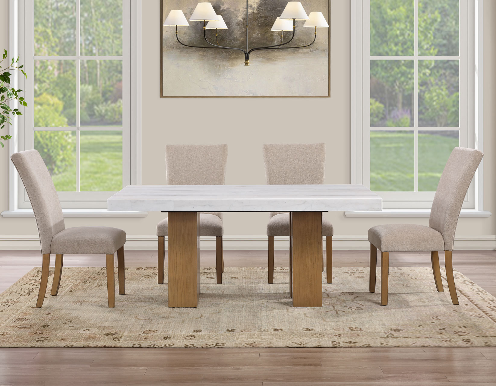 - 5-piece set includes the Artemis 70″ White Marble Dining Table, Sand Finish and 4 Artemis Beige Chenille Side Chairs. Each item also sold separately.