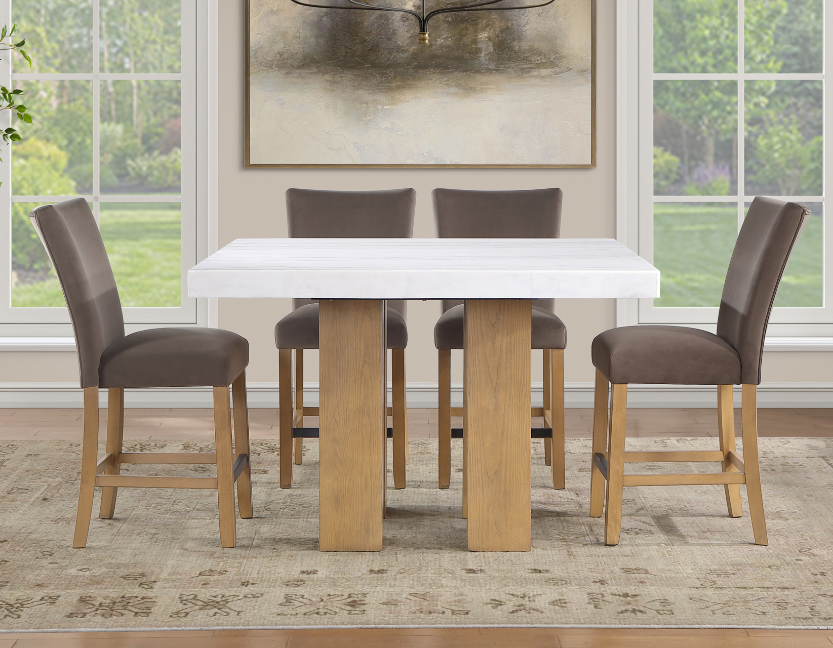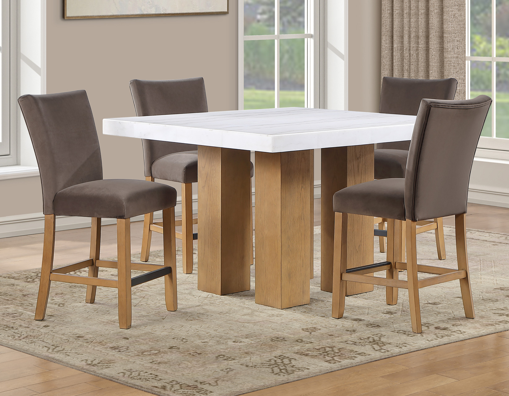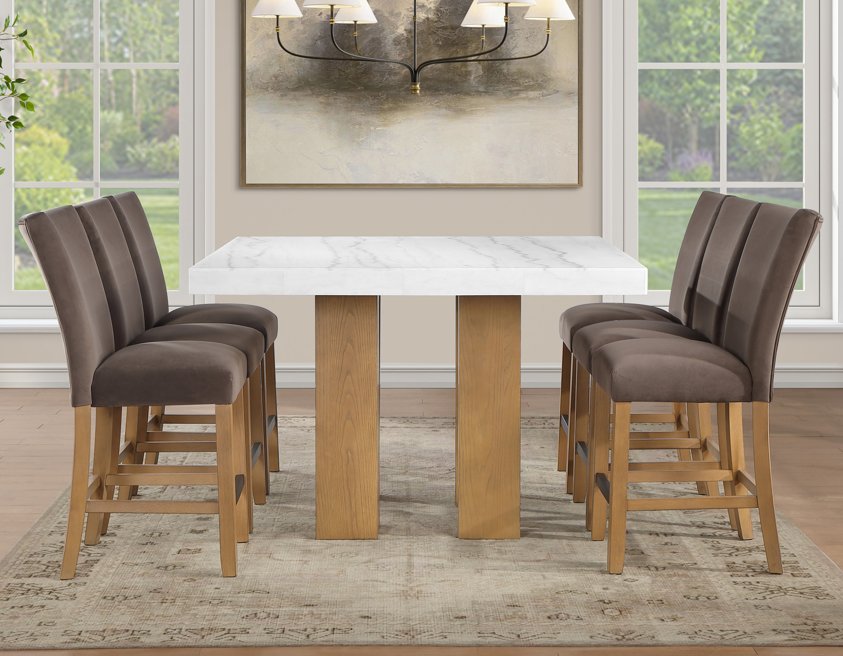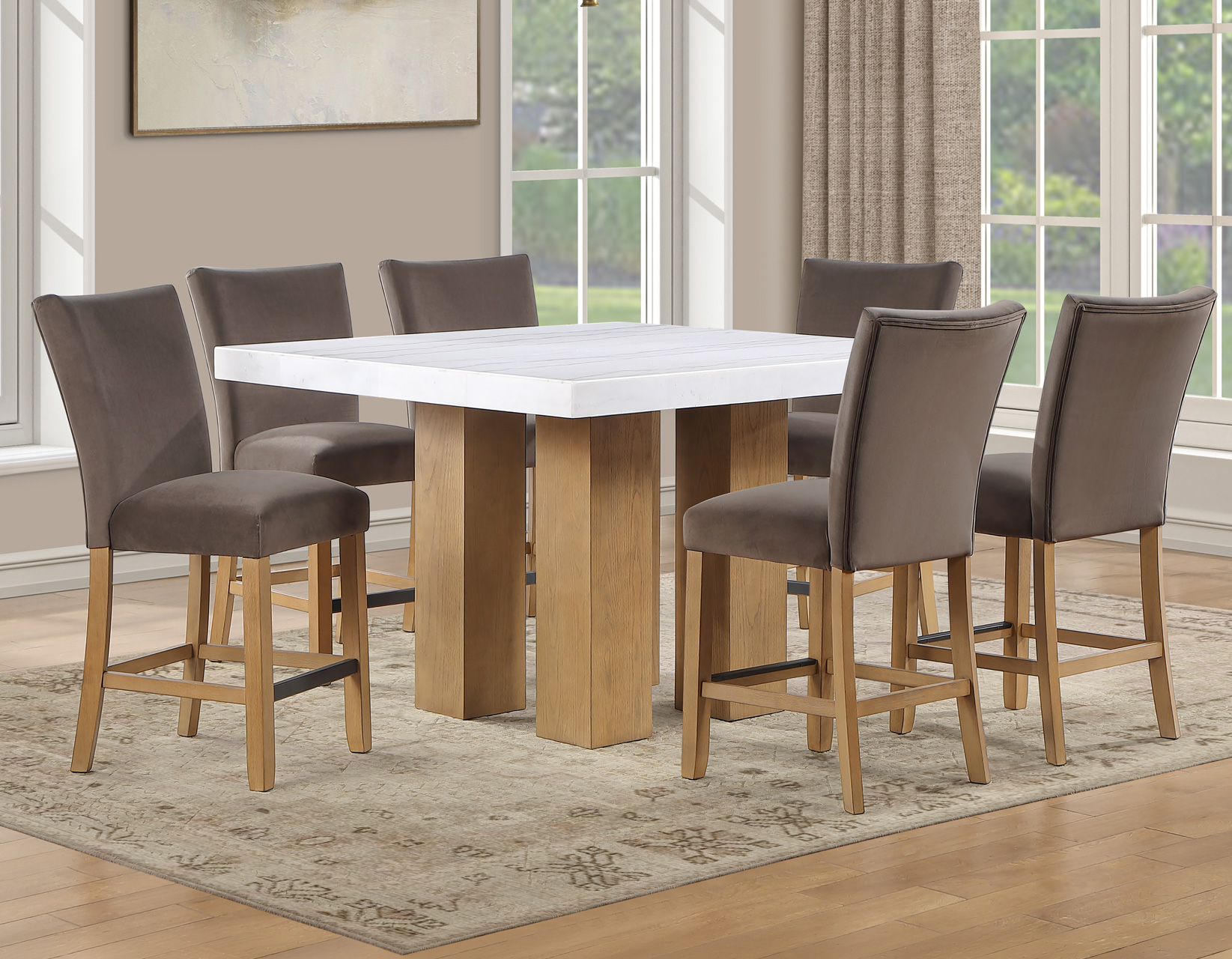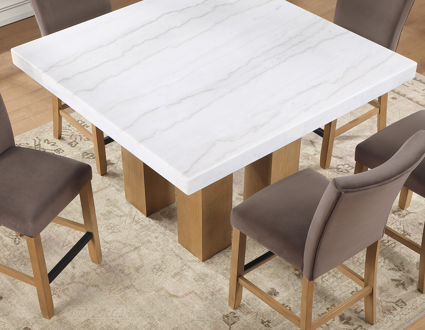Meet the Artemis 54-inch square marble counter set—where modern design feels easy and inviting. The double pedestal base brings bold architectural style, while the casual sand finish keeps the look relaxed and livable. A sleek white marble top adds just the right touch of elegance. Paired with plush brown velvet counter chairs, each designed with a perfect pitch for a comfortable seat, it’s made for gathering. At a comfortable 36″ height, it offers easy entry, lasting durability, and effortless everyday style.