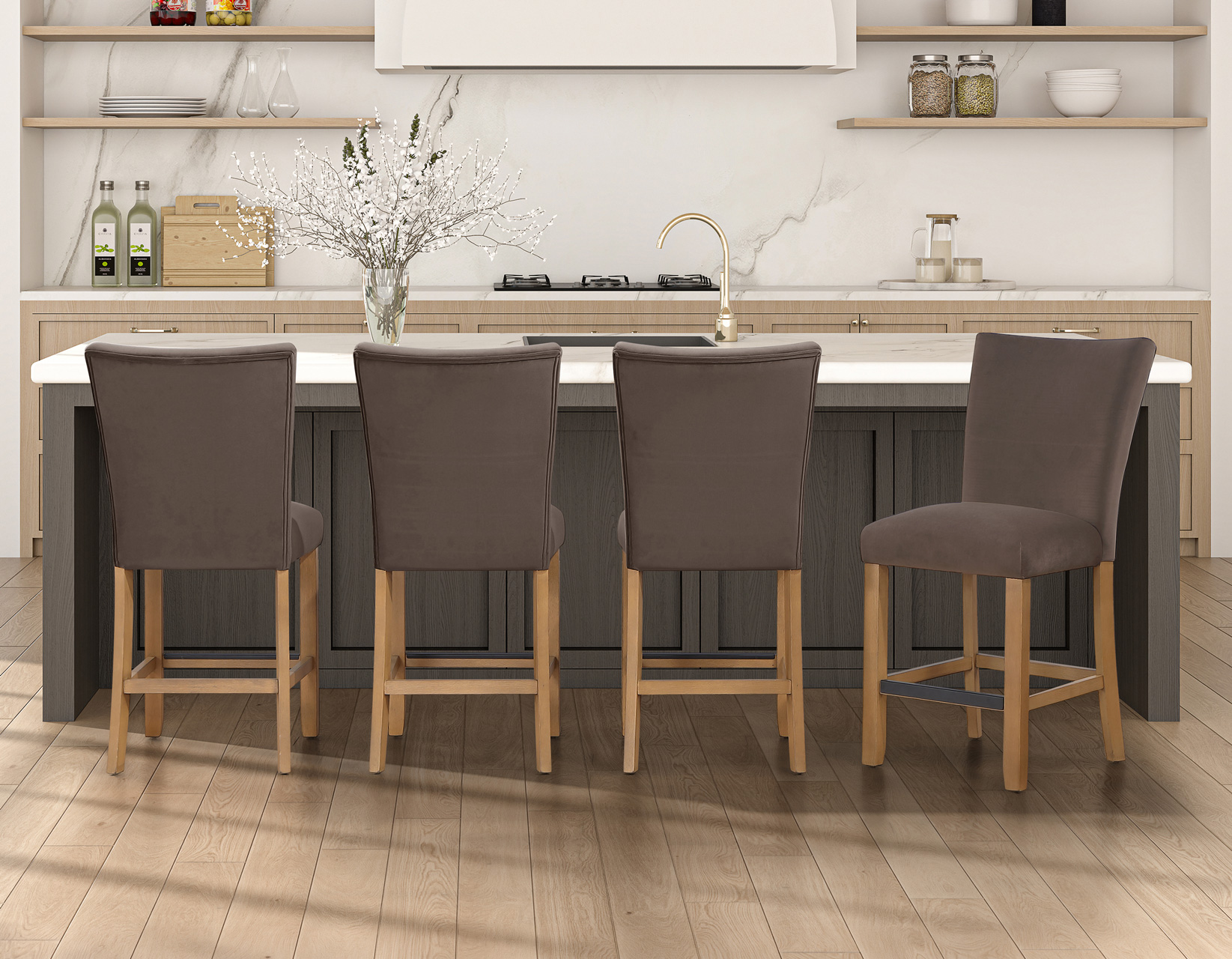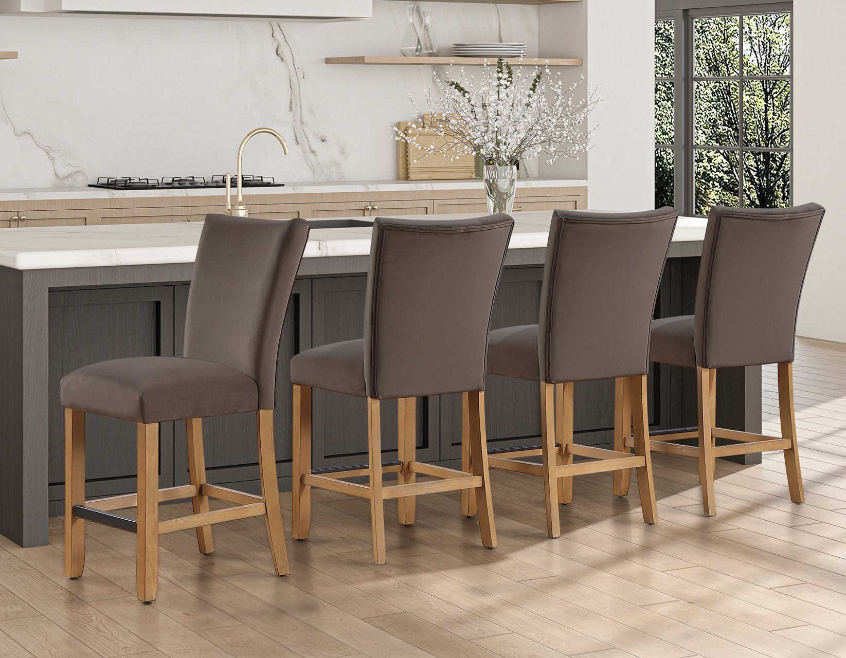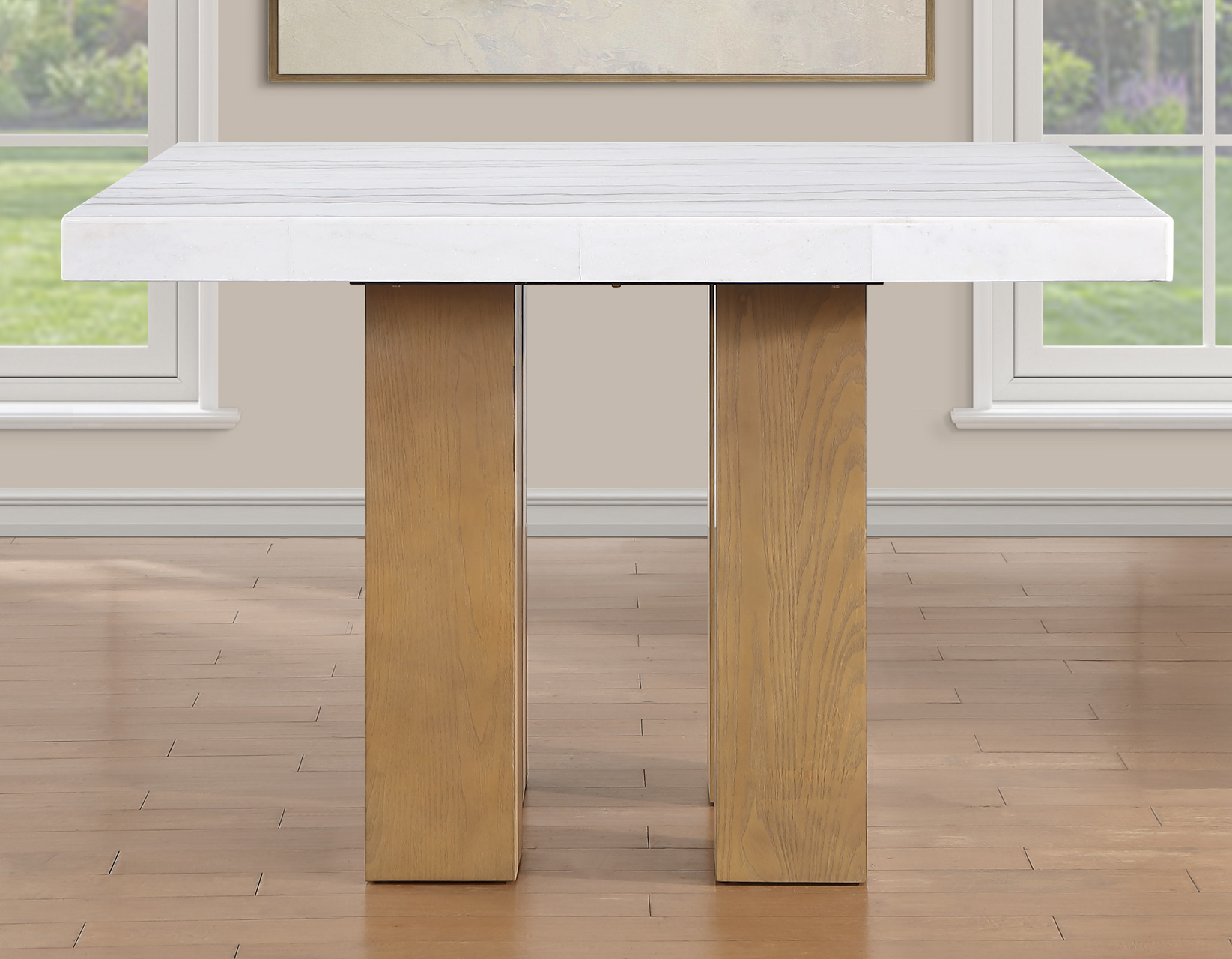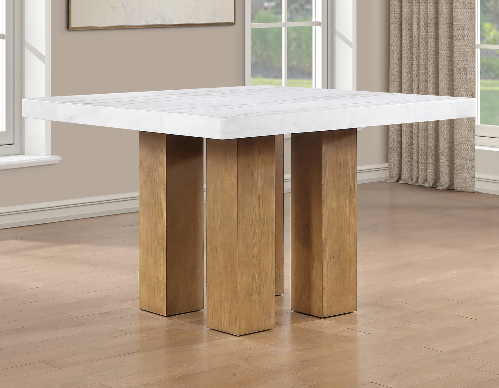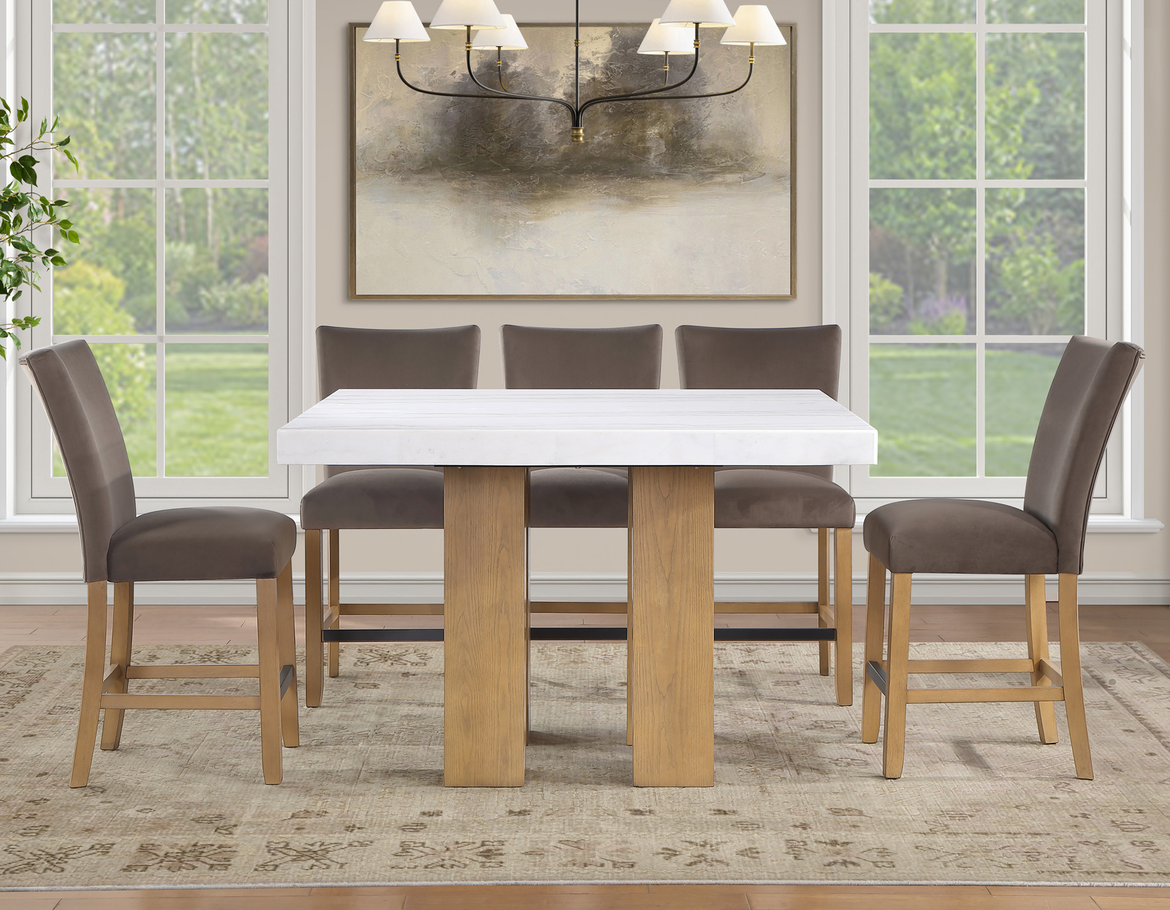 Meet the Artemis 54-inch square marble counter set—where modern design feels easy and inviting. The double pedestal base brings bold architectural style, while the casual sand finish keeps the look relaxed and livable. A sleek white marble top adds just the right touch of elegance. Paired with plush brown velvet counter chairs, each designed with a perfect pitch for a comfortable seat, it’s made for gathering. At a comfortable 36″ height, it offers easy entry, lasting durability, and effortless everyday style.