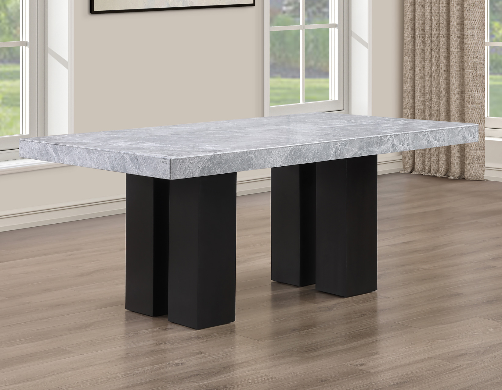 Elegant dining with a modern twist, the Artemis dining table features a beautiful gray marble top in your choice of square or rectangular shapes. Its substantial 3.5″ marble veneer top pairs with four architectural post legs in a striking double pedestal base, creating an impressive statement piece. A neutral black wood finish on the base enhances the bold scale, adding a touch of boldness and elegance to the design.