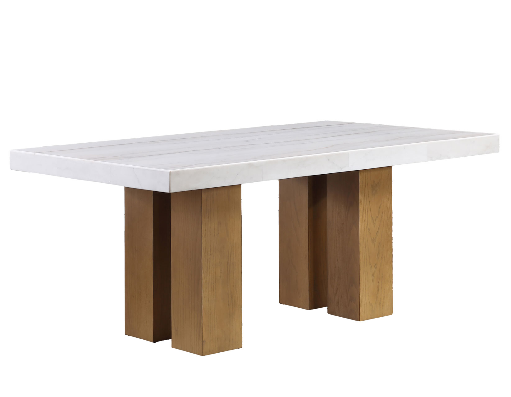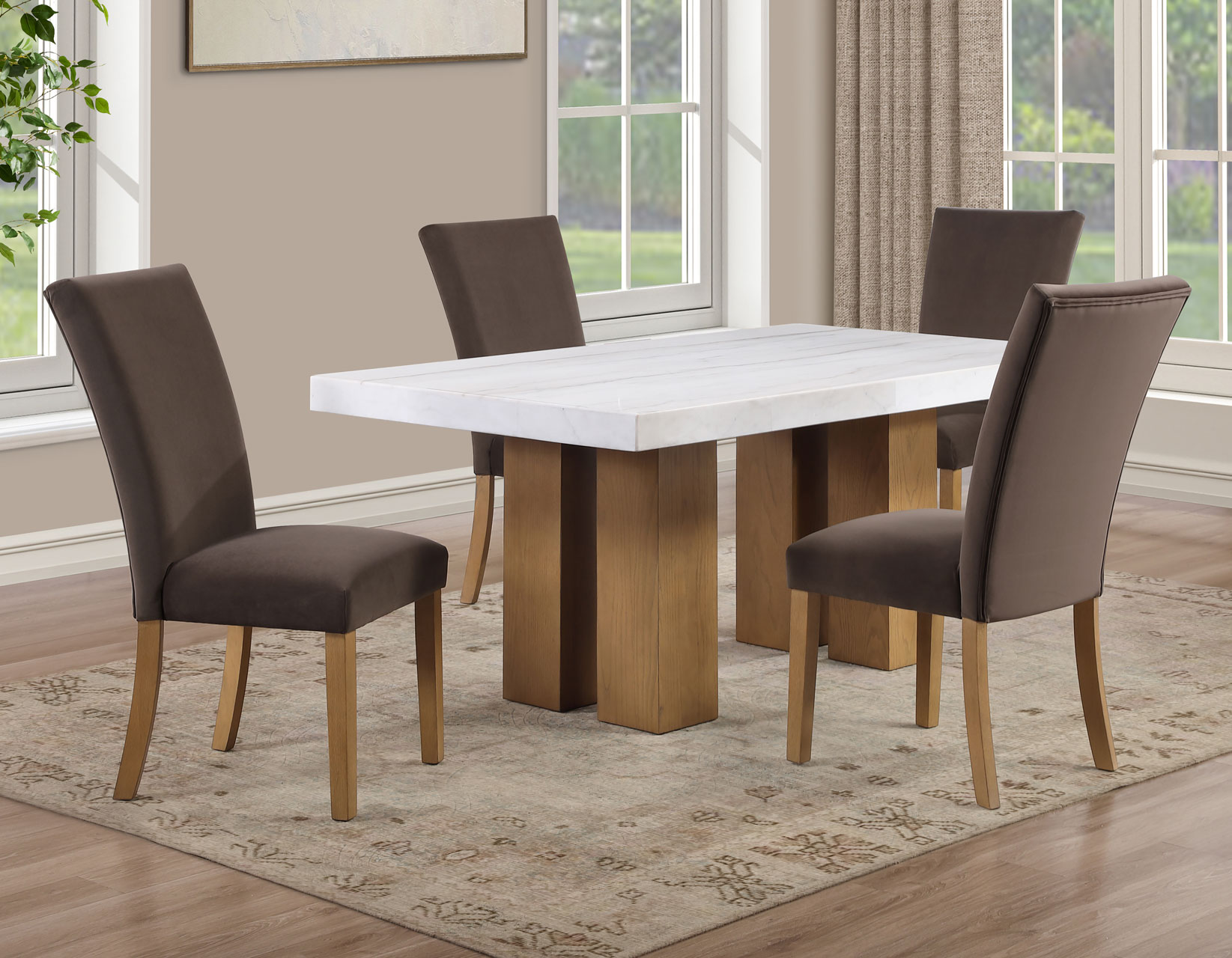 Artemis 70″ Rect White Marble Table, Tan Finish w/4 Green Velvet Chairs