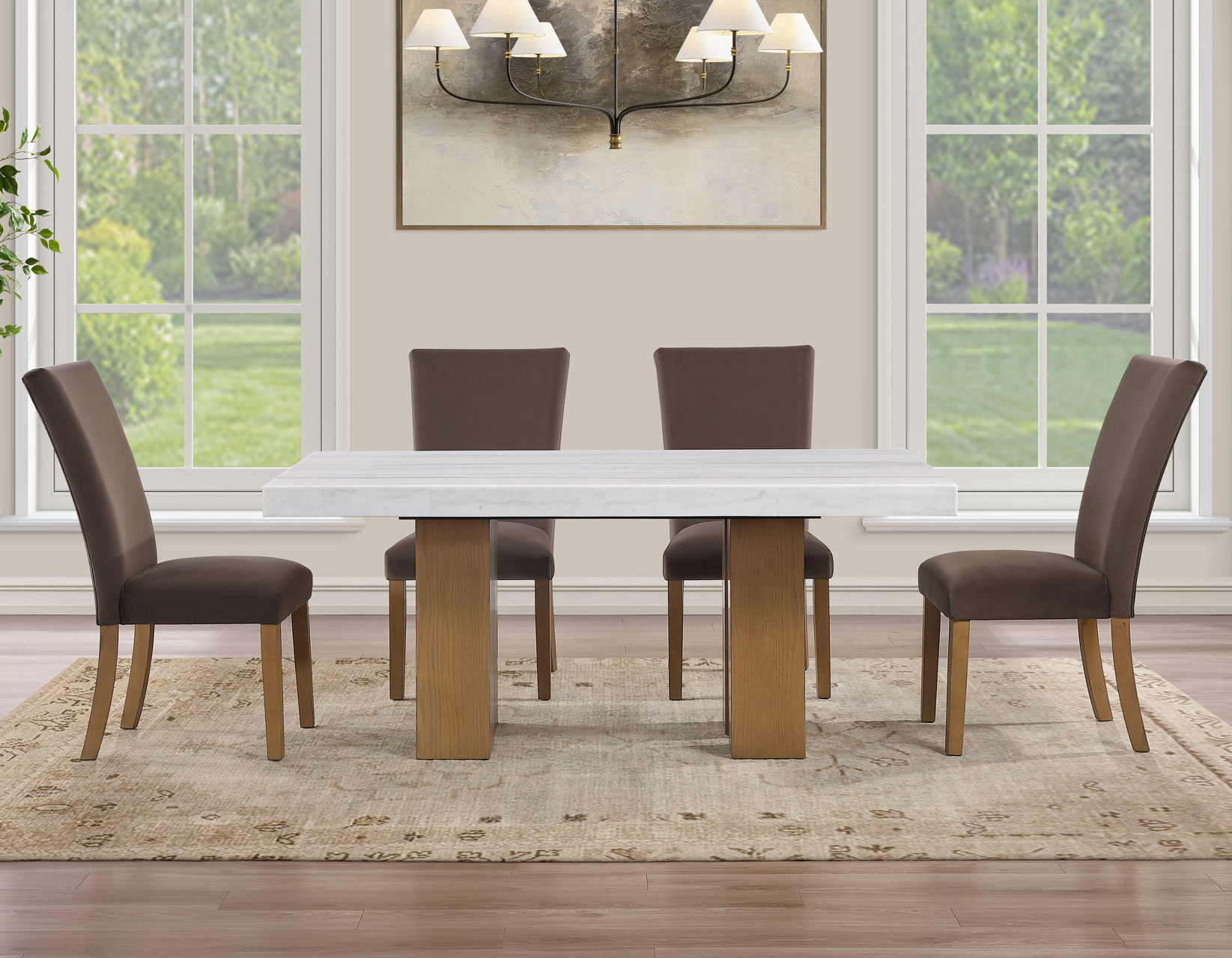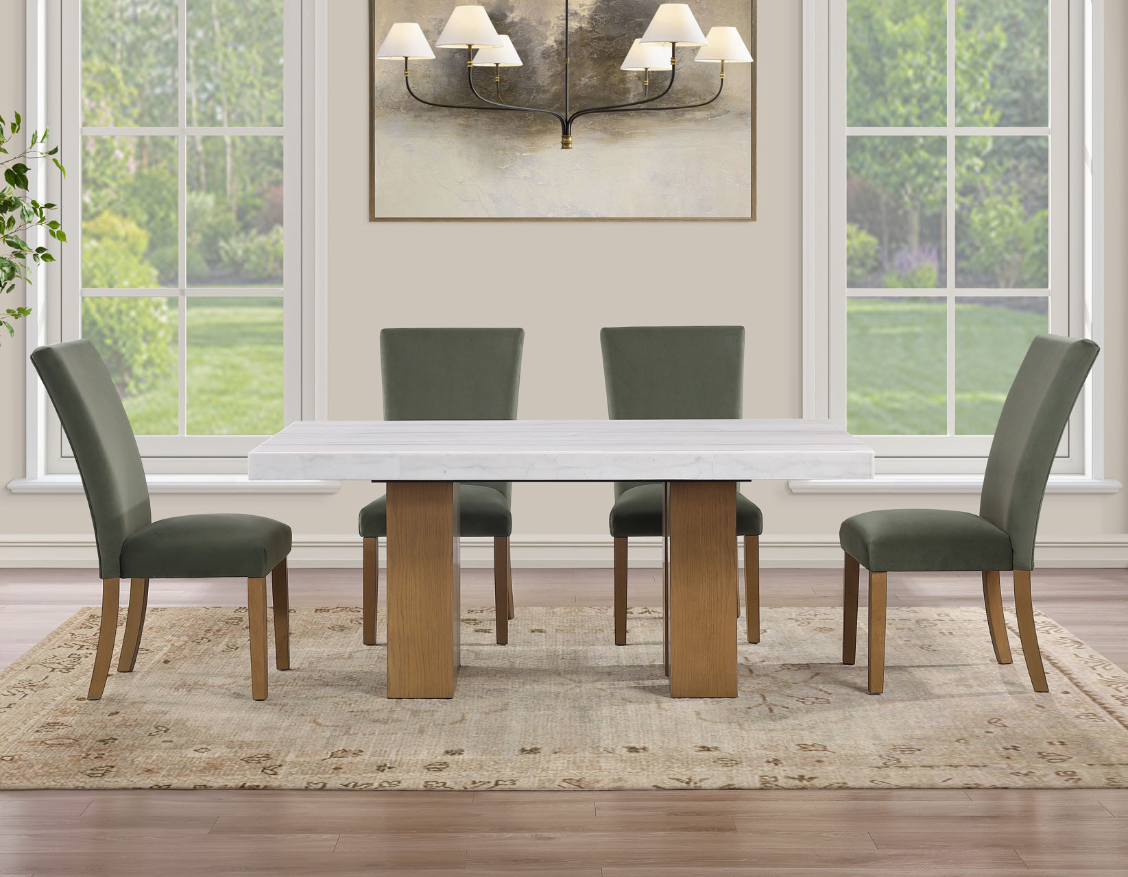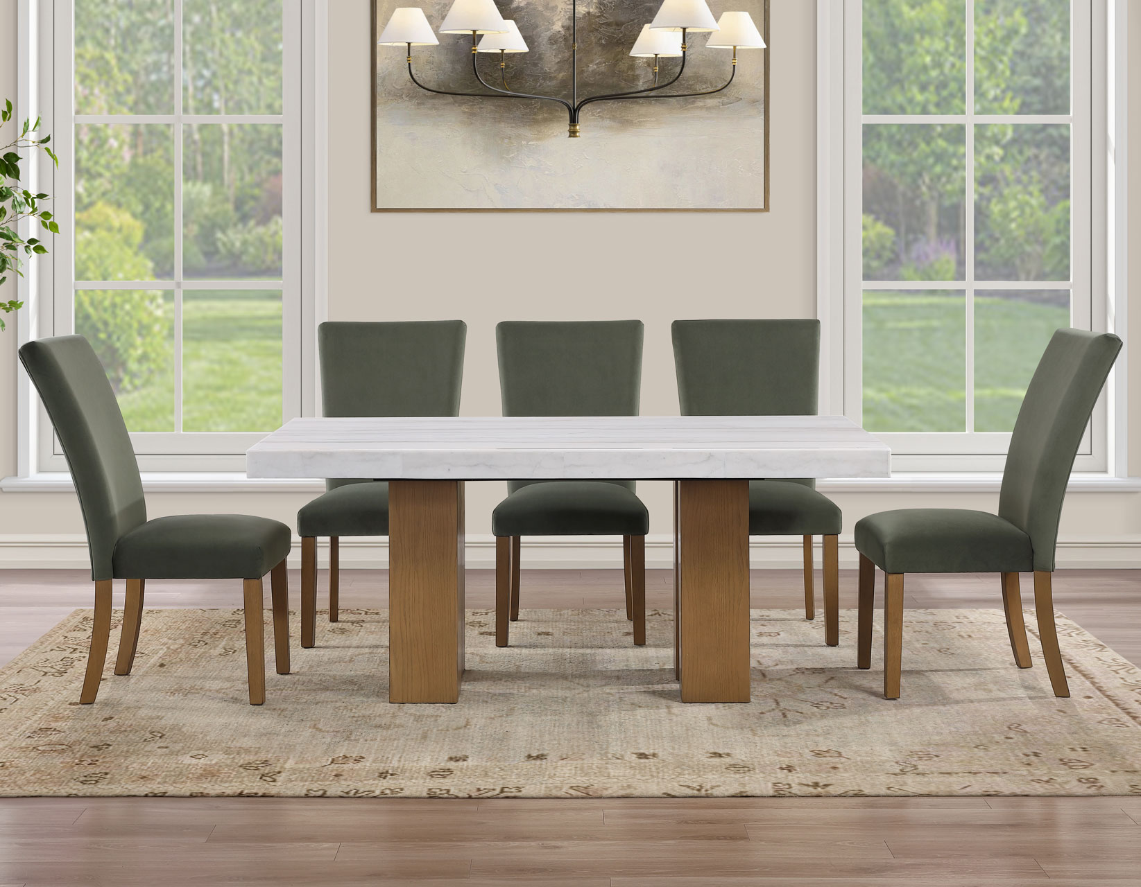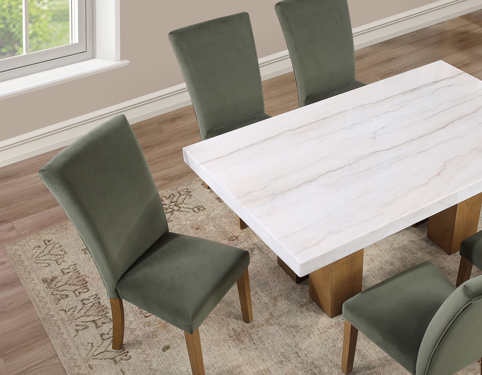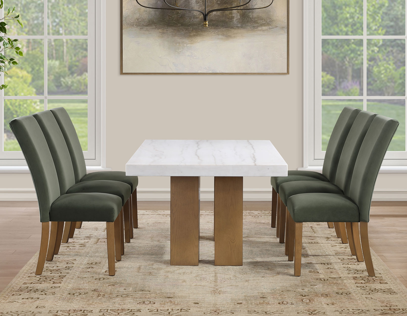 Meet the Artemis 70-inch marble top table—where modern design feels easy and inviting. The architectural base brings bold style, while the casual sand finish keeps the look relaxed and livable. A sleek white marble top adds just the right touch of elegance. Paired with plush green velvet chairs, each designed with a perfect pitch for a comfortable seat, it’s made for gathering. With solid wood legs and screwed corner joints, this set delivers the durability you need with the style you want.