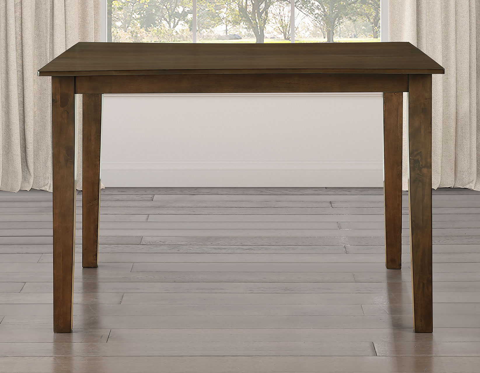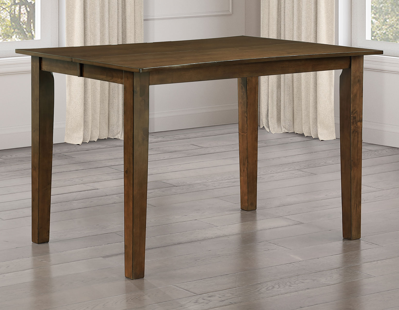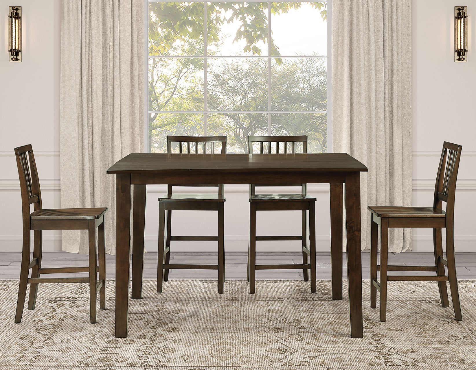 The Joplin 5-Piece Counter Height Dining Set blends classic farmhouse charm with modern style. The 36-inch-high table features a rich walnut finish over walnut veneers for a warm, transitional look. A 12-inch leaf extends the table from 42 to 54 inches, seating up to eight guests. Four schoolhouse-inspired counter stools showcase crescent-shaped backs with a mid-century modern touch. Crafted from solid wood with reinforced construction and scooped seats, this set offers lasting durability and everyday comfort for casual dining spaces.