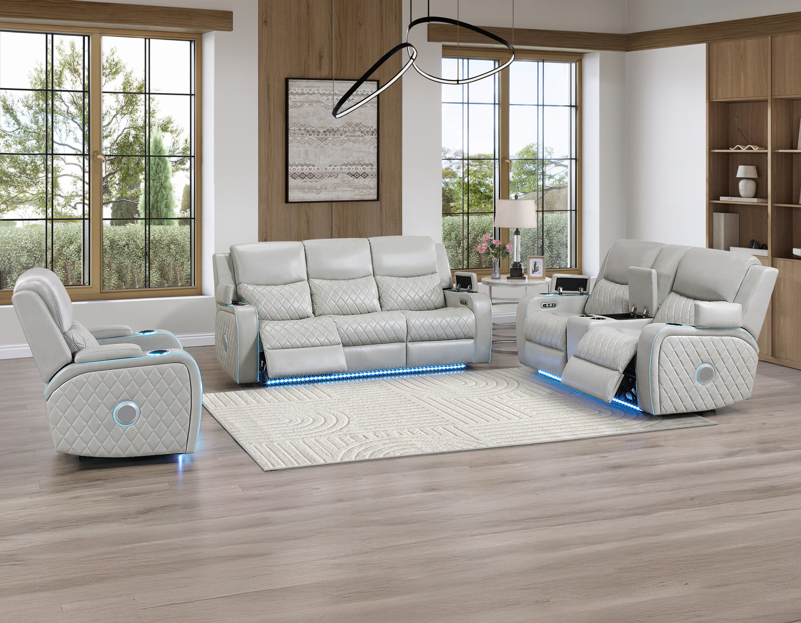 Relax in modern style with the Luna Ice, upholstered in smooth, icy-gray vegan leather featuring an elegant argyle-quilted pattern on the seats, backs, and sides for a refined, high-end look. Effortless power recline lets you adjust the back and footrest to your perfect position, while built-in speakers create immersive sound. A sleek center console offers wireless charging, USB-A & C ports, ambient lighting, and convenient storage—bringing sophisticated design and smart entertainment to your living space for the ultimate at-home theater experience.