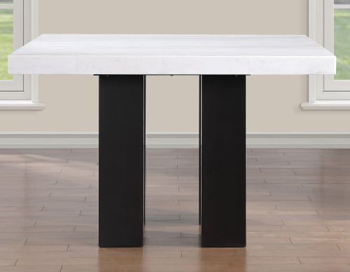 - Styling details include plank-effect top, double pedestal base with exposed tenons