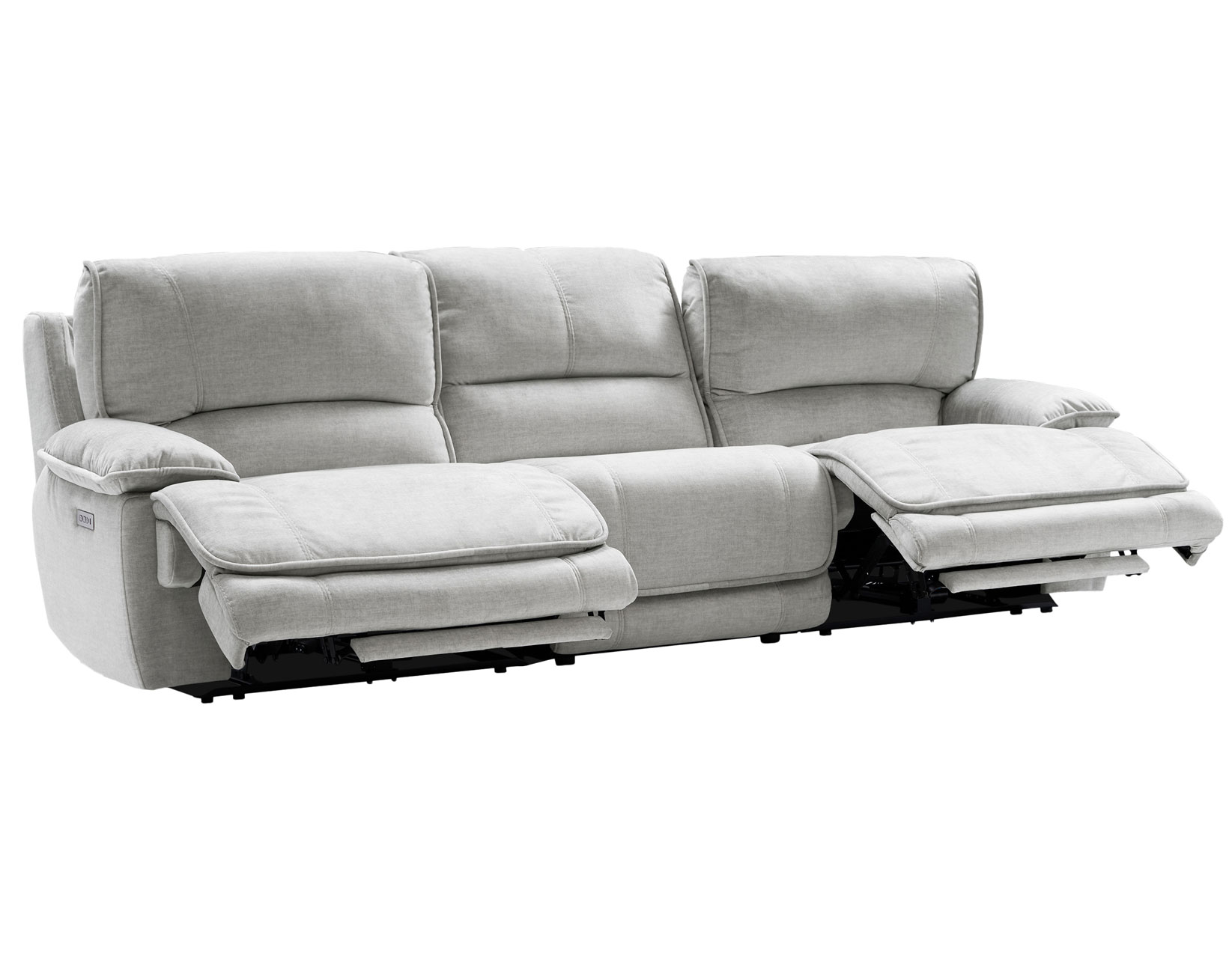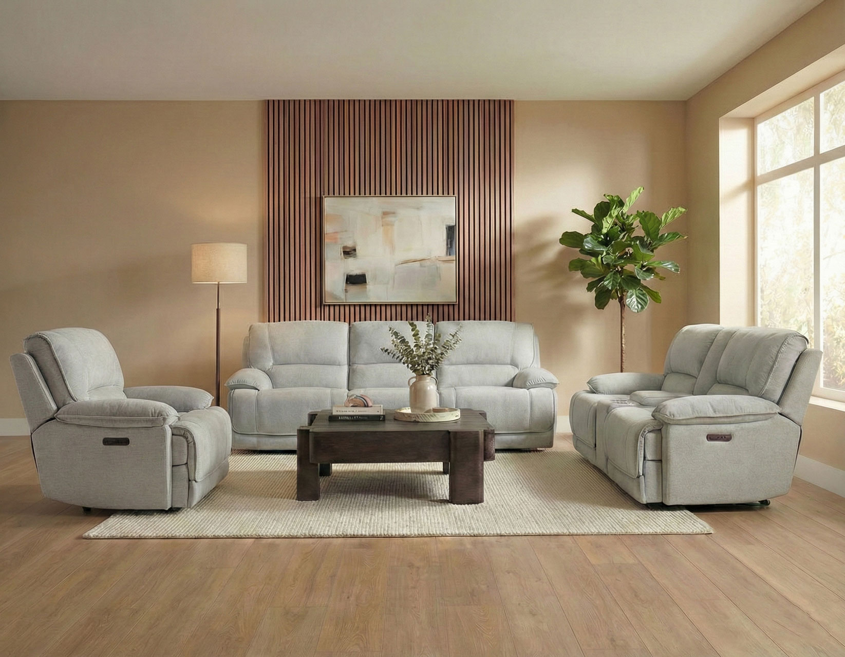 Relax in premium comfort with the Olsen 3-Piece Dual-Power Set, featuring a sofa, console loveseat, and recliner in a clean, transitional style that fits both modern and classic spaces. Upholstered in plush, low-pile 100% silver polyester, each piece offers lasting softness and durability. Dual-power controls let you independently adjust the headrest and footrest, while supportive construction ensures everyday comfort and long-term reliability for the whole room.