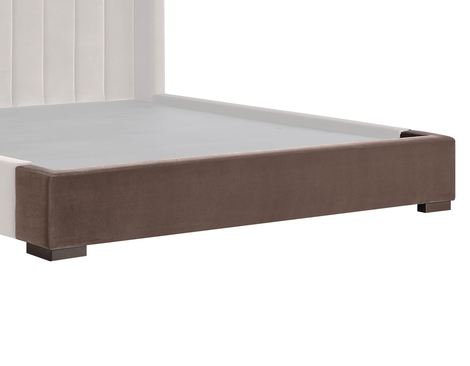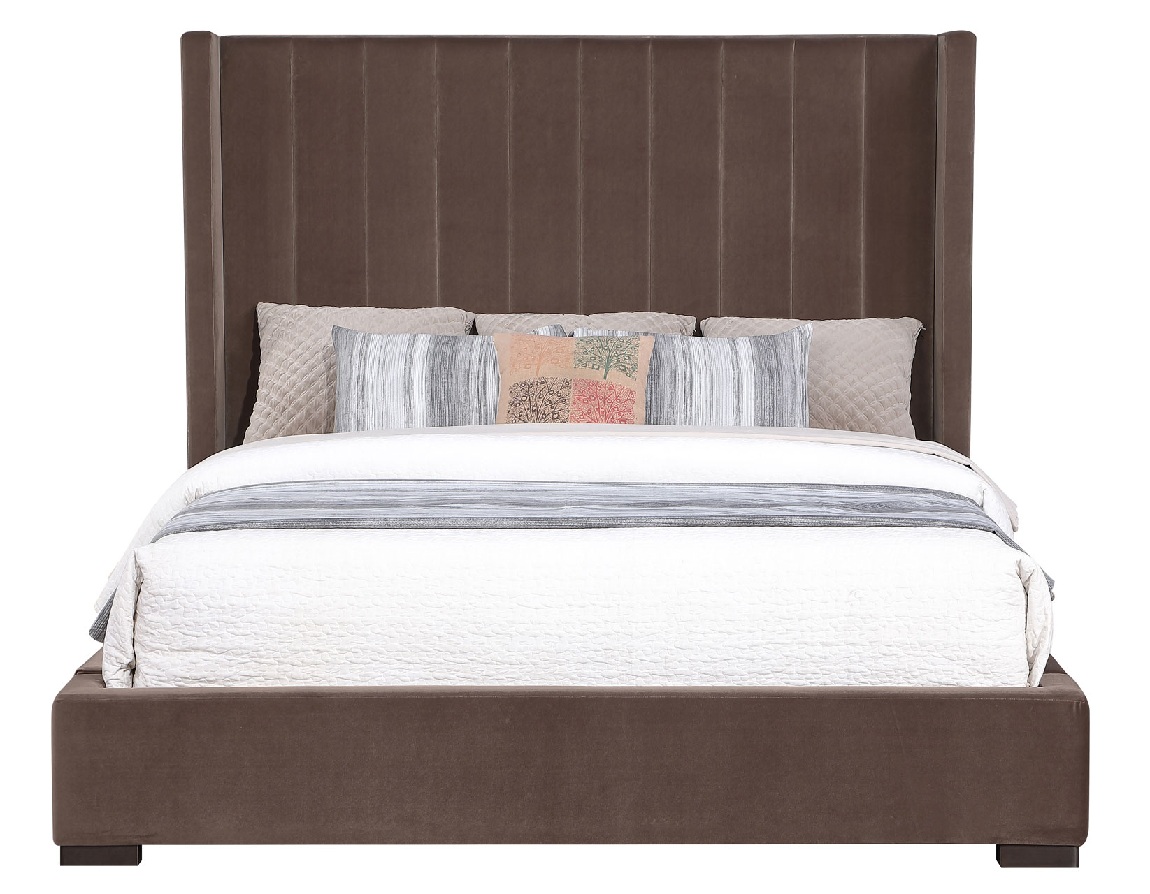 Crafted of 100% polyester chocolate velvet fabric, foam, engineered woods and solid Asian hardwoods
