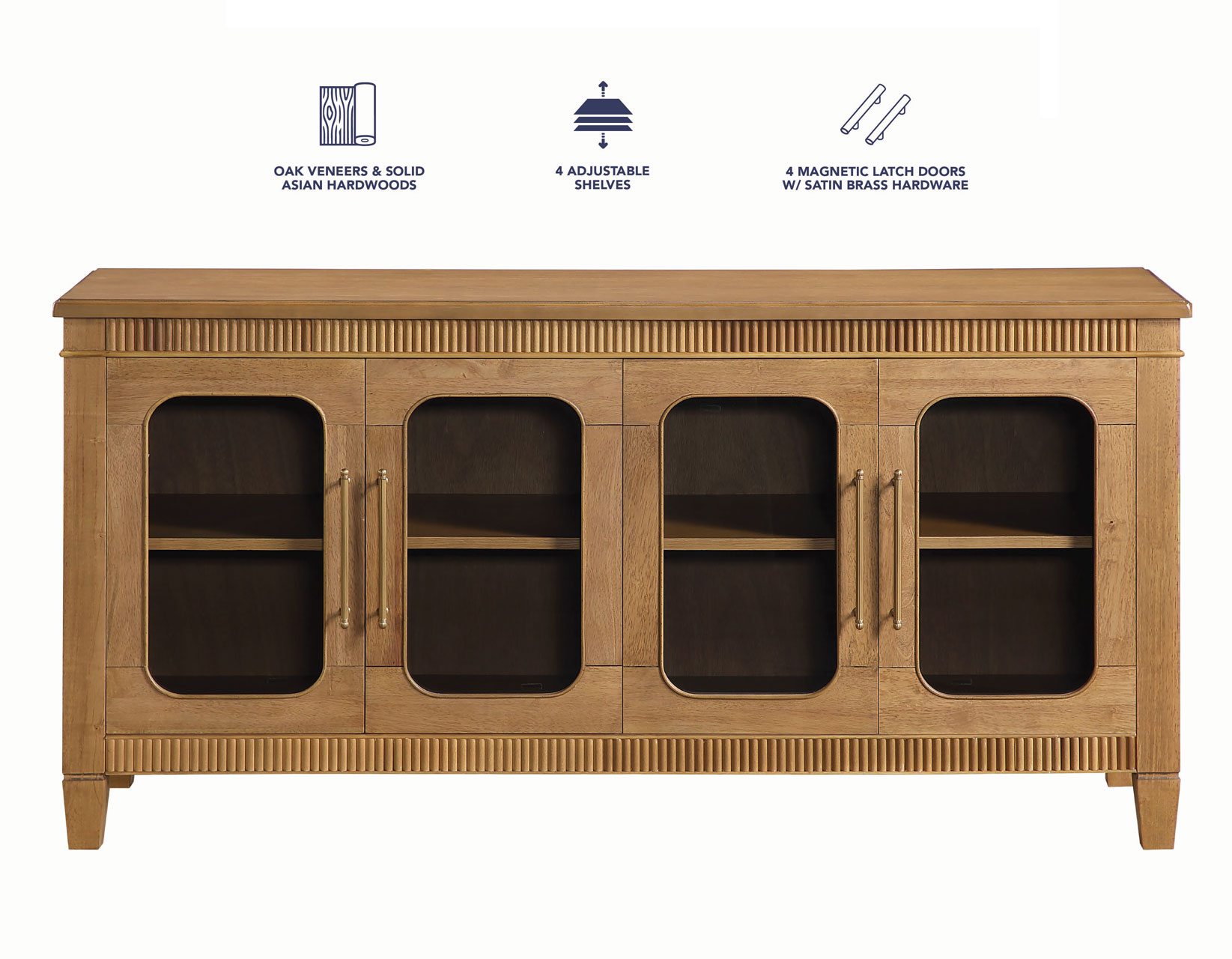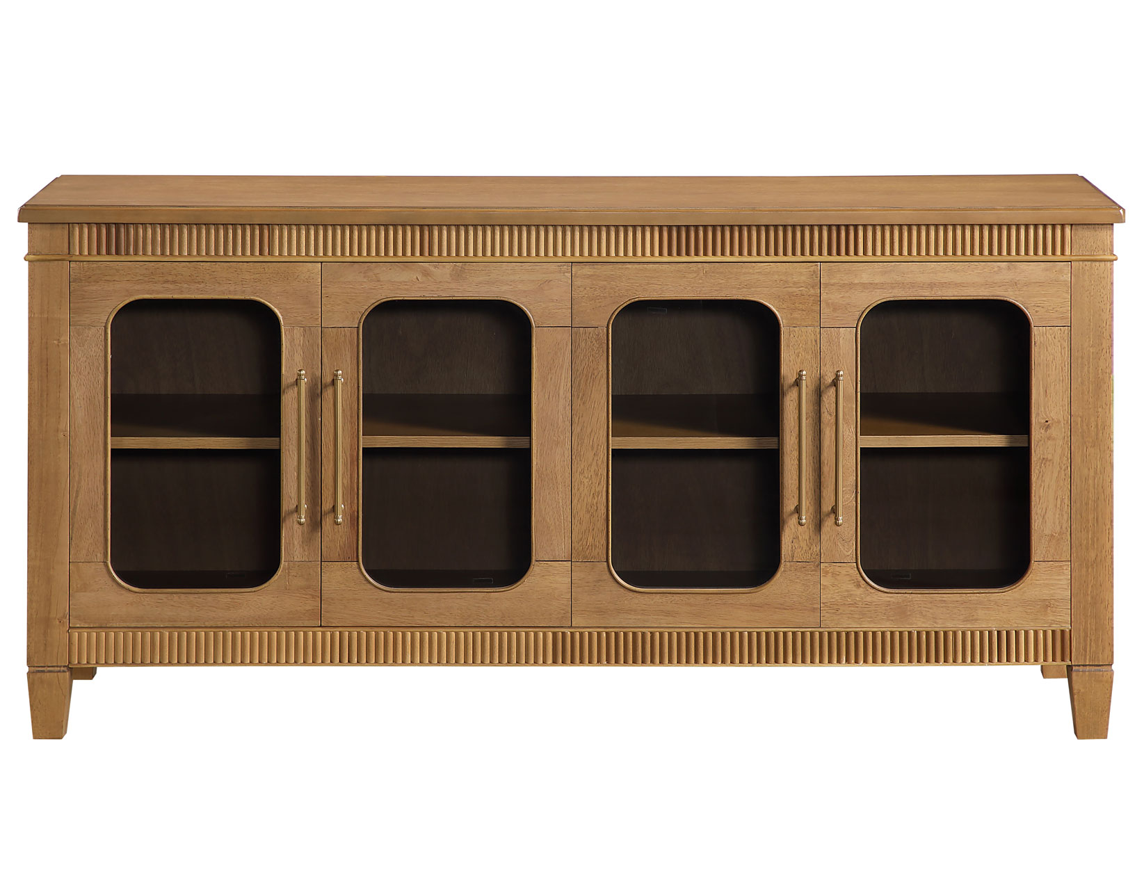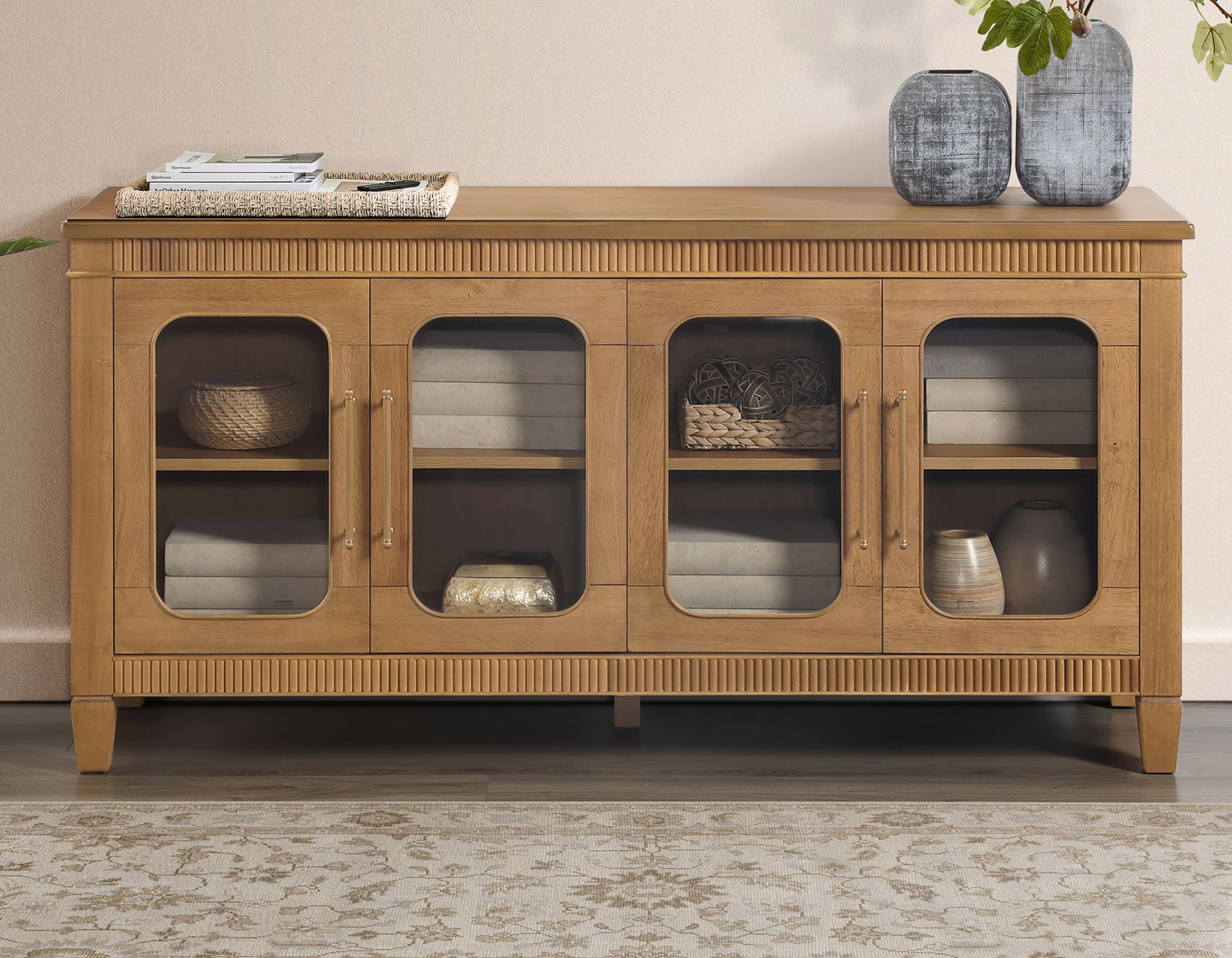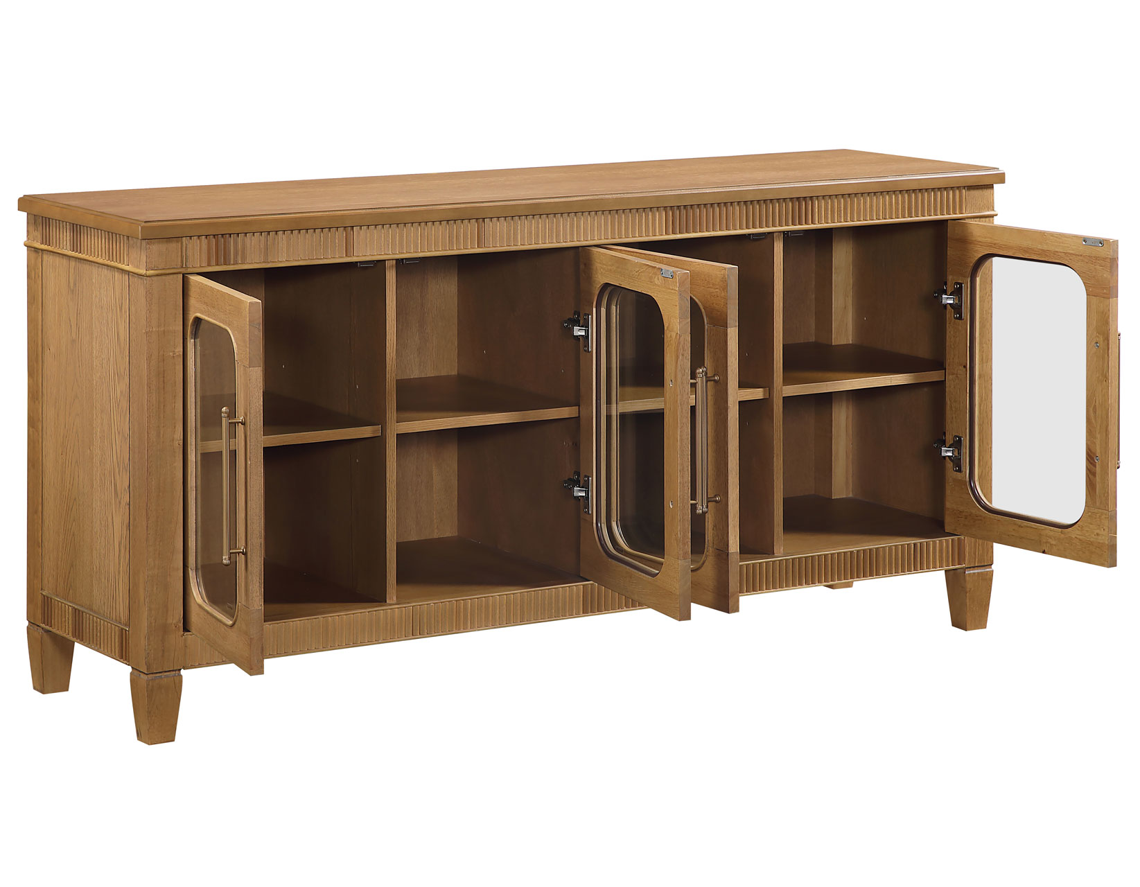 The Preston Butterscotch Server brings warmth, charm, and versatile functionality to any room. Its rich butterscotch finish highlights the classic dentil molding and rounded glass doors, creating a welcoming, stylish presence. Four adjustable shelves provide customizable storage within four spacious cubbies, while magnetic latch doors ensure secure, reliable closure. Perfect as a dining server, entertainment console, hallway accent, or sofa table, Preston offers beautiful display options, practical organization, and a timeless design that enhances both traditional and contemporary interiors with effortless appeal.