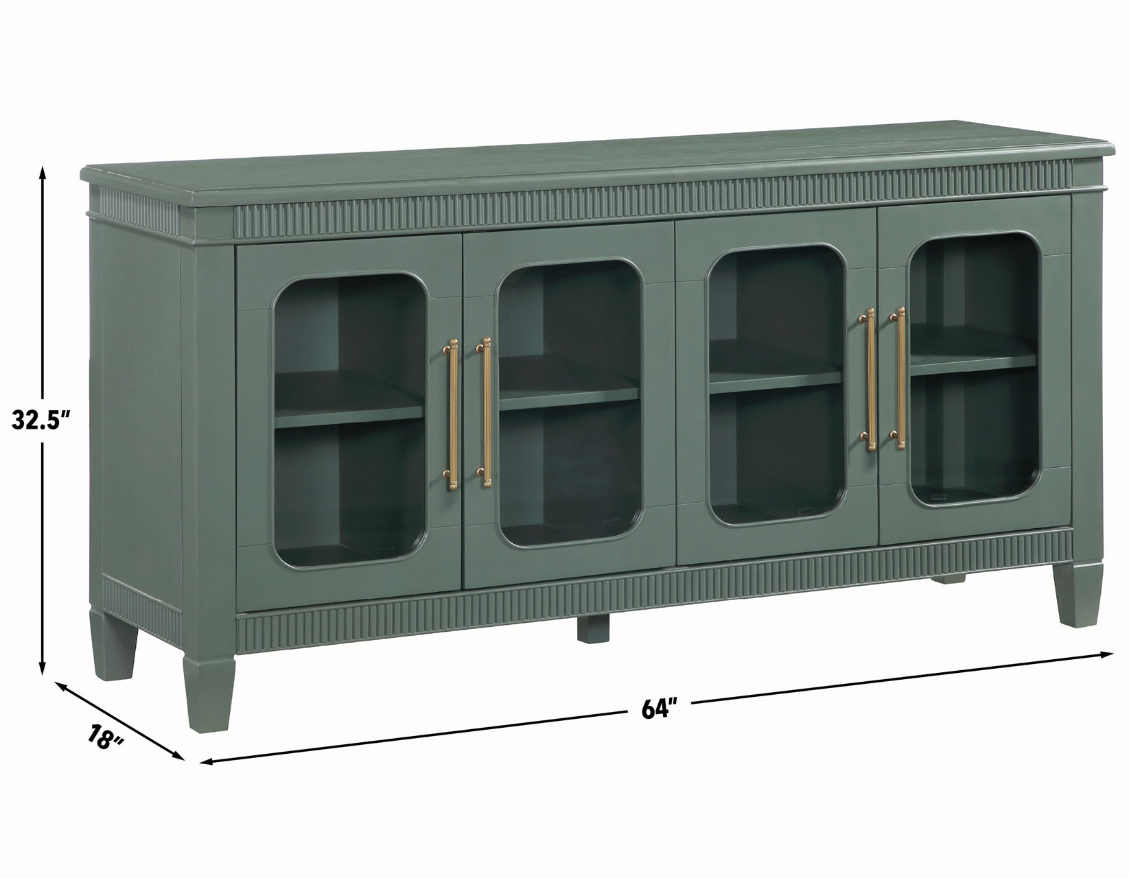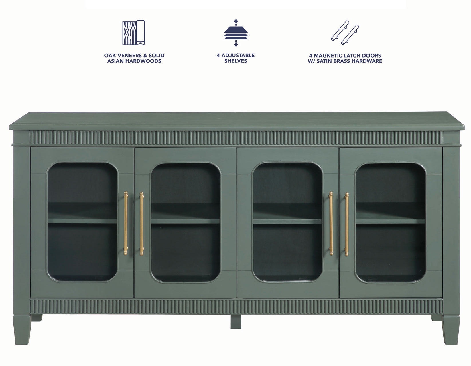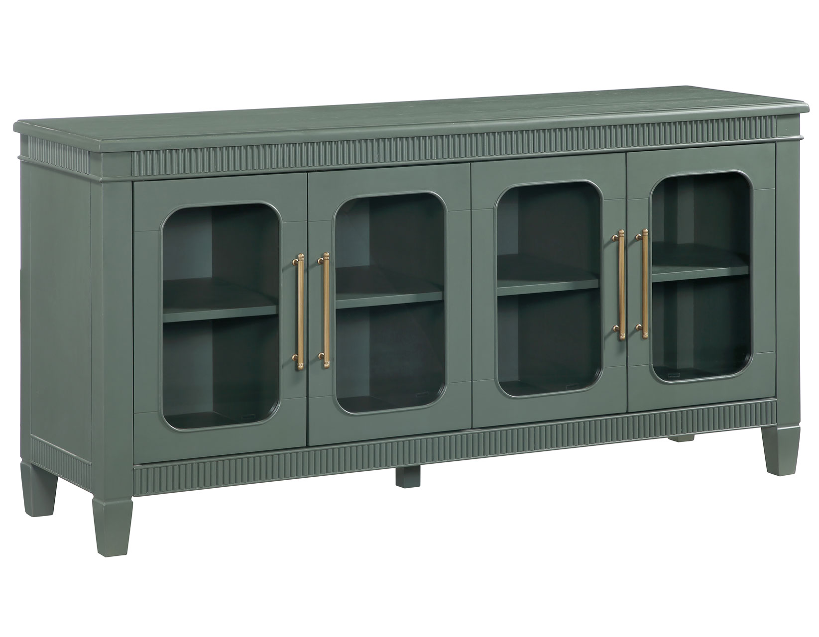 The Preston Green Server blends classic styling with modern versatility, making it a standout accent for any room. Finished in a soft sage green, it features dentil molding and rounded glass doors that create an elegant, inviting look. Four adjustable shelves allow customized storage within four spacious cubbies, while magnetic latch doors provide secure, reliable closure. Perfect as a dining server, entertainment console, hallway accent, or sofa table, Preston offers beautiful display options, functional organization, and timeless charm for any home.