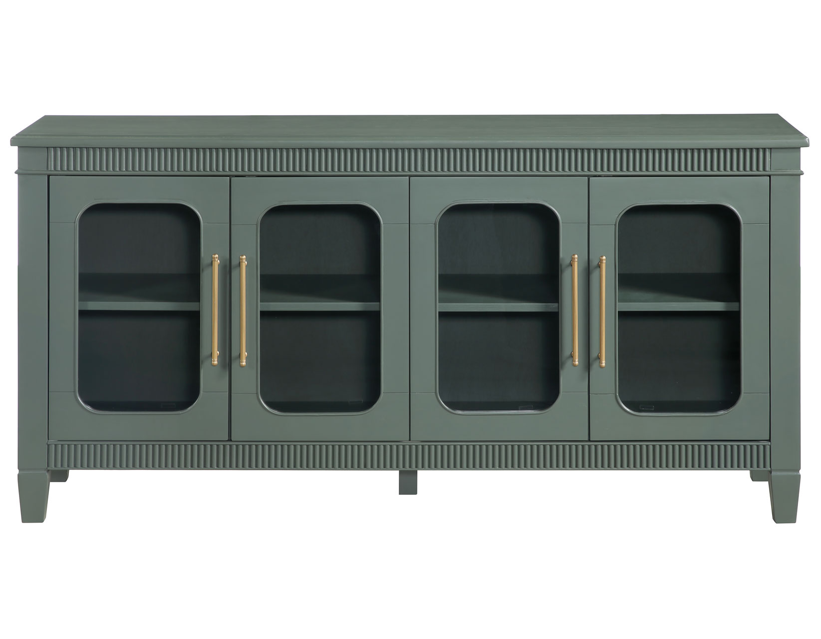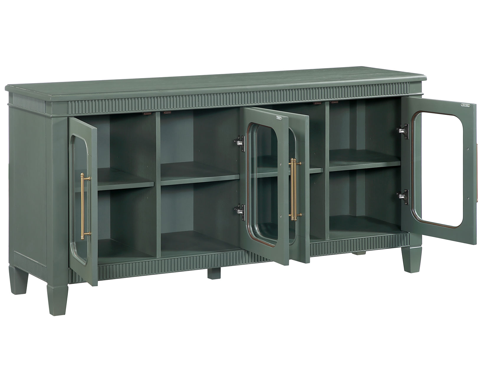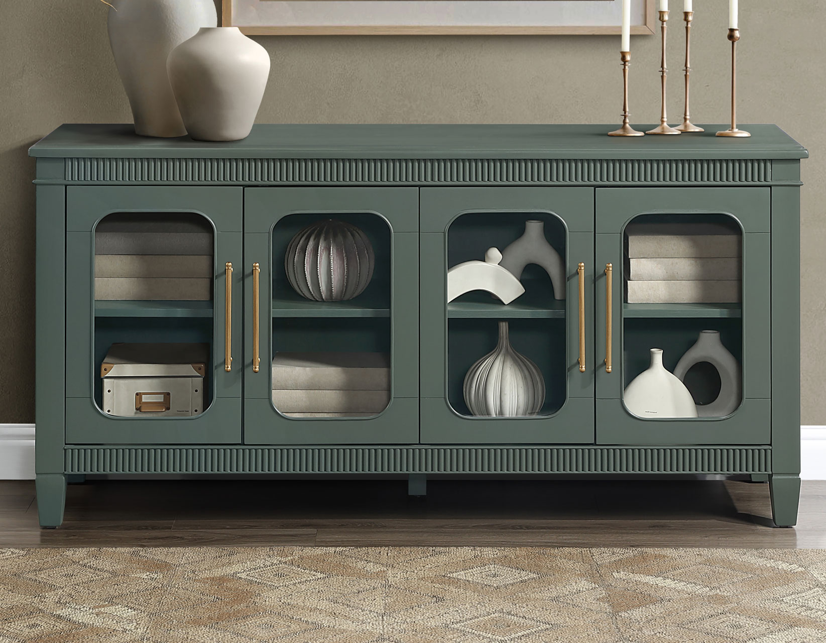 The Preston Green Server blends classic styling with modern versatility, making it a standout accent for any room. Finished in a soft sage green, it features dentil molding and rounded glass doors that create an elegant, inviting look. Four adjustable shelves allow customized storage within four spacious cubbies, while magnetic latch doors provide secure, reliable closure. Perfect as a dining server, entertainment console, hallway accent, or sofa table, Preston offers beautiful display options, functional organization, and timeless charm for any home.