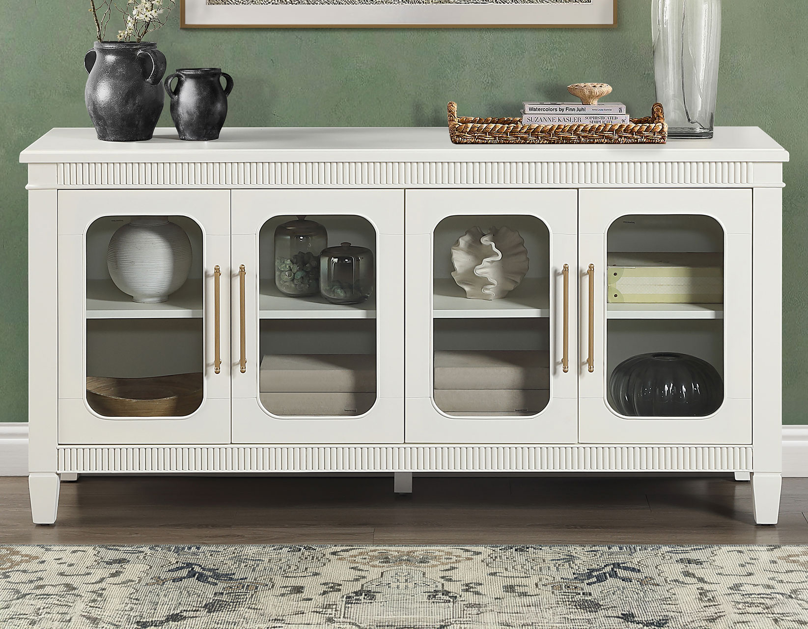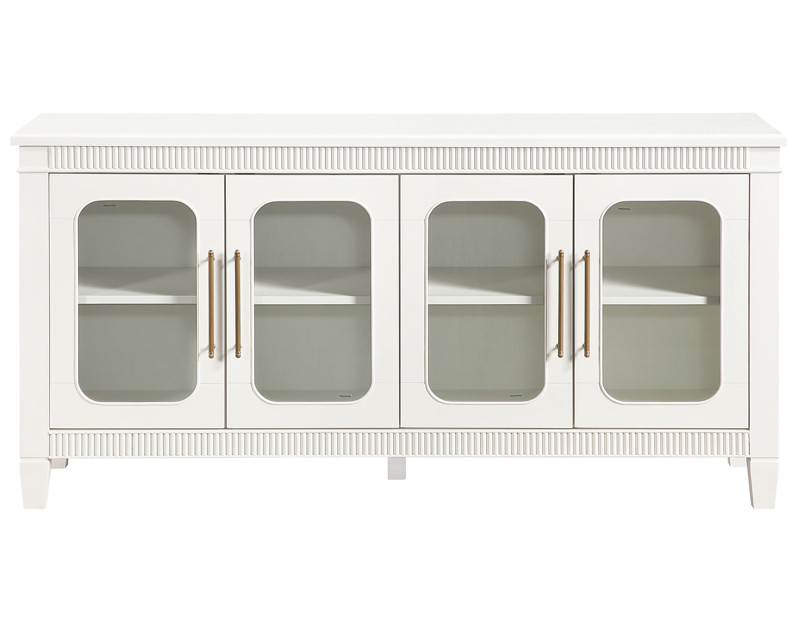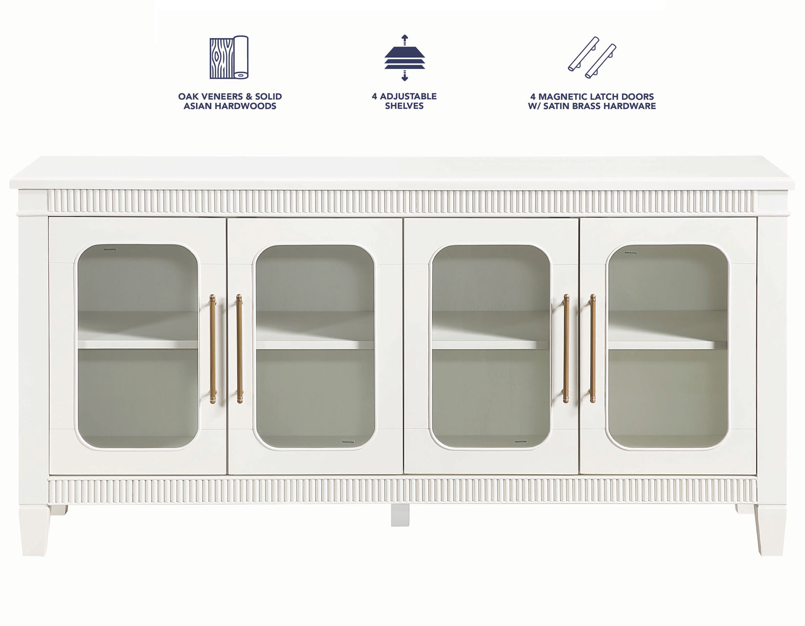 The Preston Ivory Server blends timeless design with modern functionality, making it a versatile accent for any room. Its soft ivory finish enhances the classic dentil molding and rounded glass doors, creating a bright, elegant presence. Four adjustable shelves offer customizable storage across four spacious cubbies, while magnetic latch doors ensure secure, reliable closure. Ideal as a dining server, entertainment console, hallway accent, or sofa table, Preston delivers stylish display space, practical organization, and a clean, sophisticated look that complements any décor.