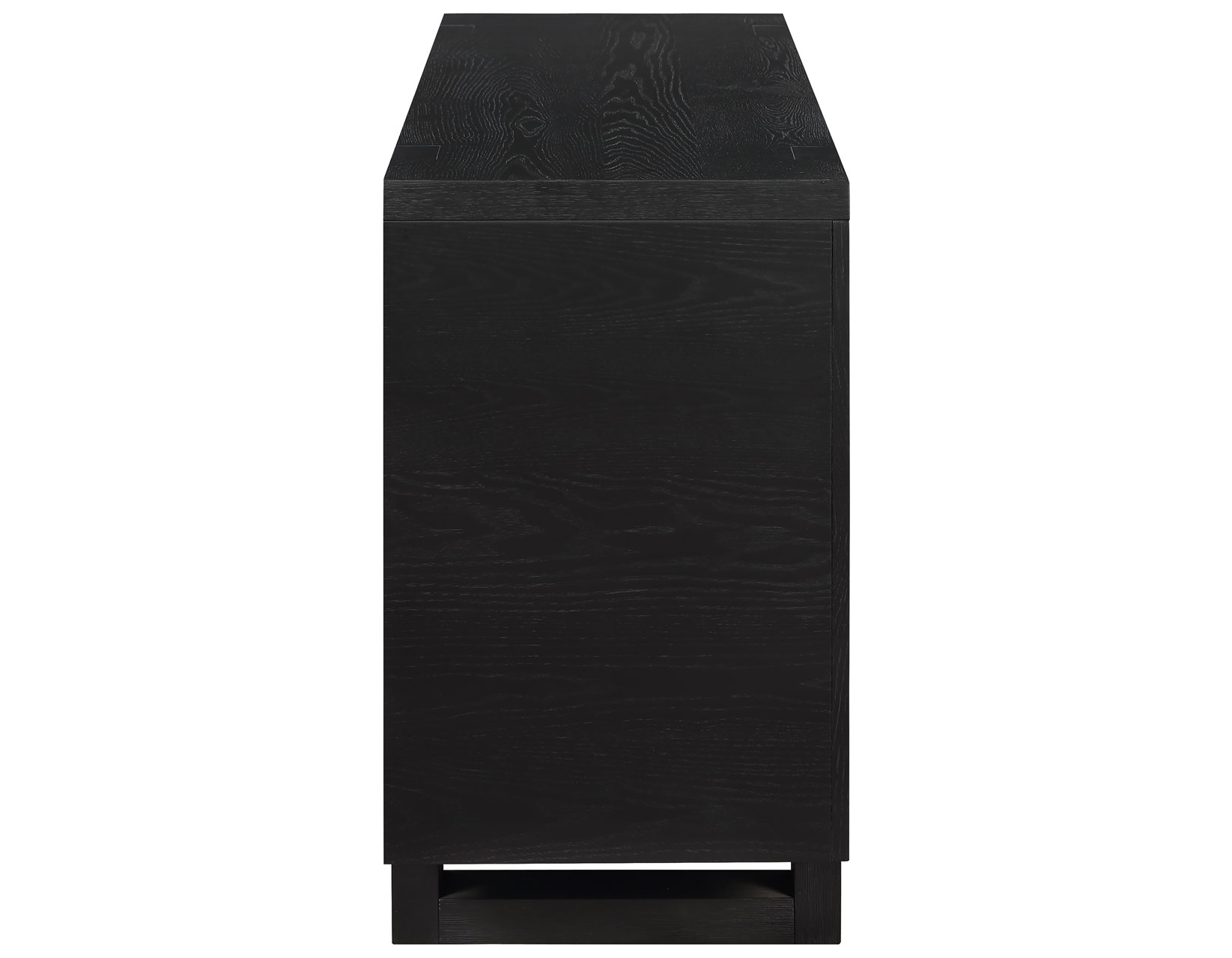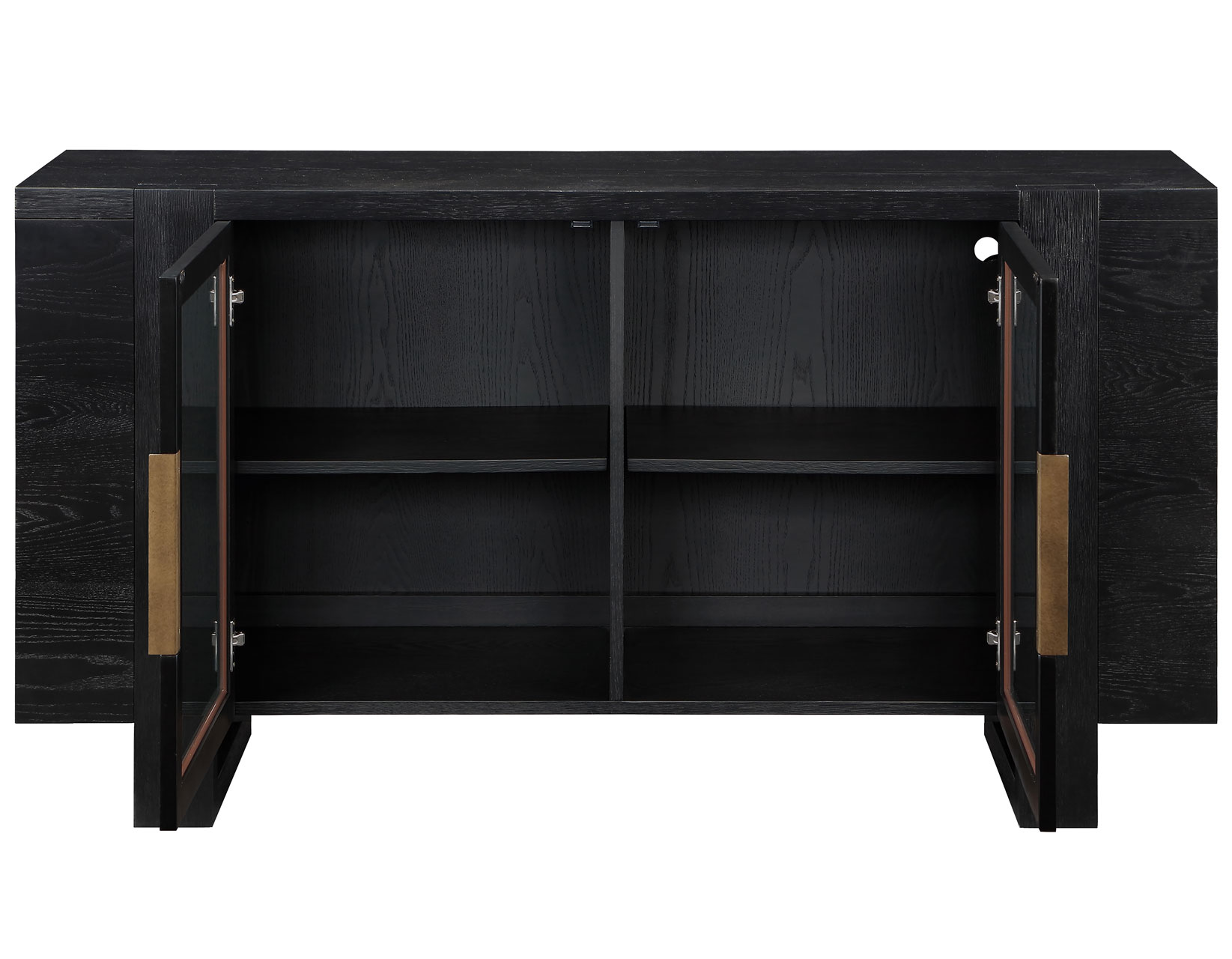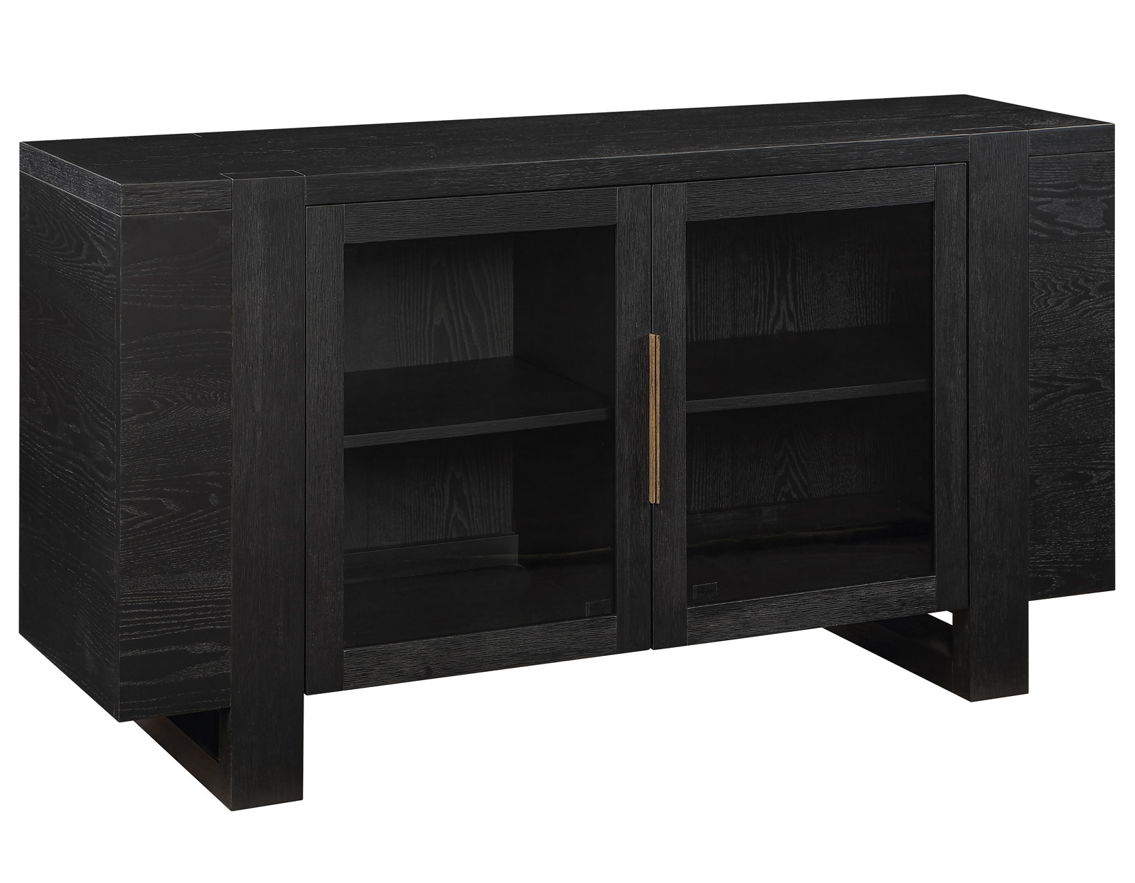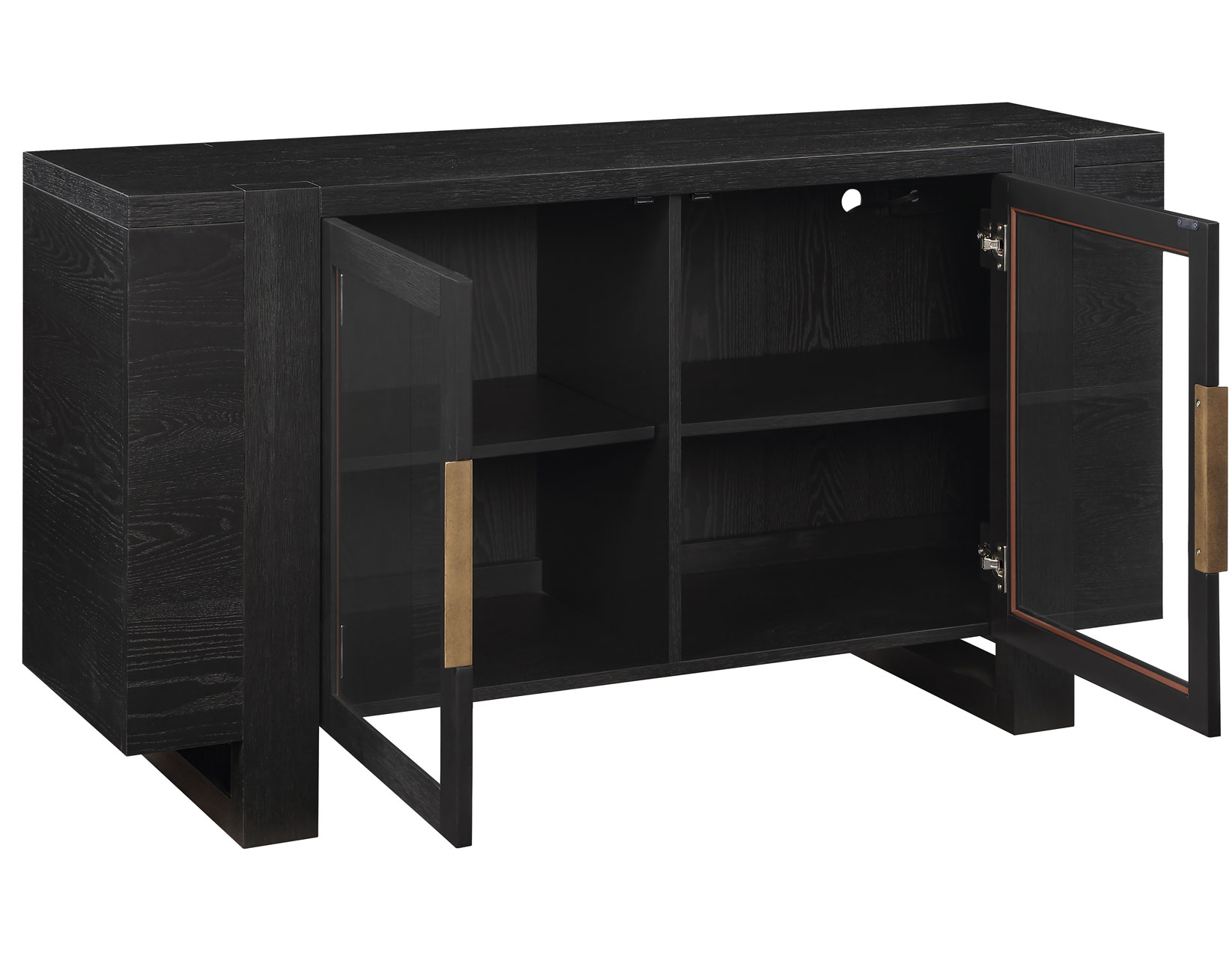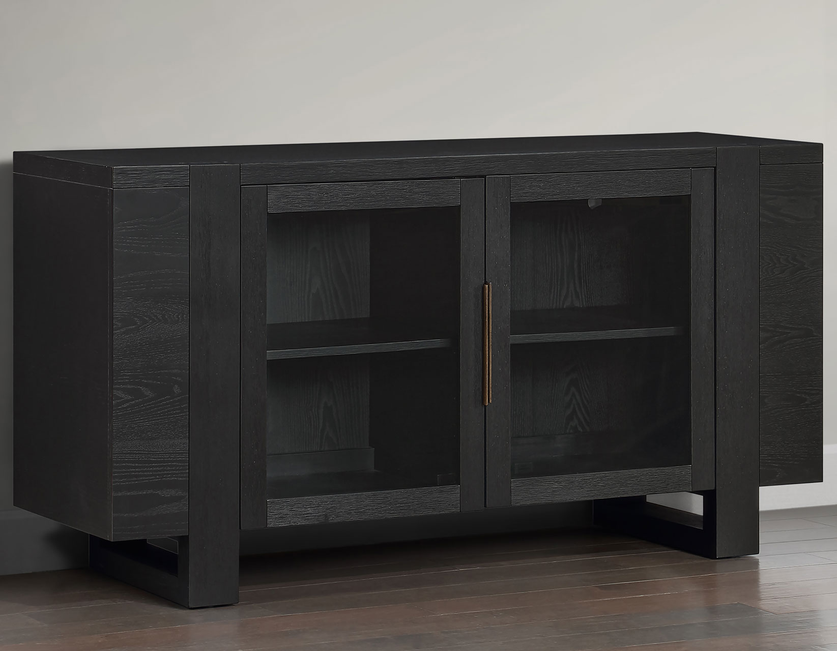 The Reid 60″ Server offers a modern take on a versatile dining and entertainment piece. Its rich midnight black finish over ash veneers delivers a bold, refined look for any room. Two glass doors provide display, storage, and easy remote access, while two adjustable interior shelves customize space for décor or electronics. Convenient charging is built in with two electric outlets plus USB-A and USB-C ports on the outer upper back, paired with a wire escape for organized cords. Clean lines complete the look overall.