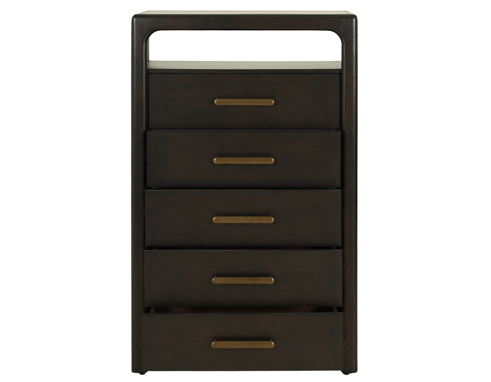 The Sigmund 5-Drawer Chest adds a touch of modern-rustic sophistication to the bedroom with its graceful, elongated profile. Crafted from oak veneers and solid Asian hardwoods in a rich sable finish, it delivers durable, spacious storage through five English-dovetailed drawers that open with smooth, secure glides. Subtle design elements—like the collection’s softly rounded edges and sculpted corners—enhance its warm, refined character, making the chest both a practical storage piece and an eye-catching design statement.