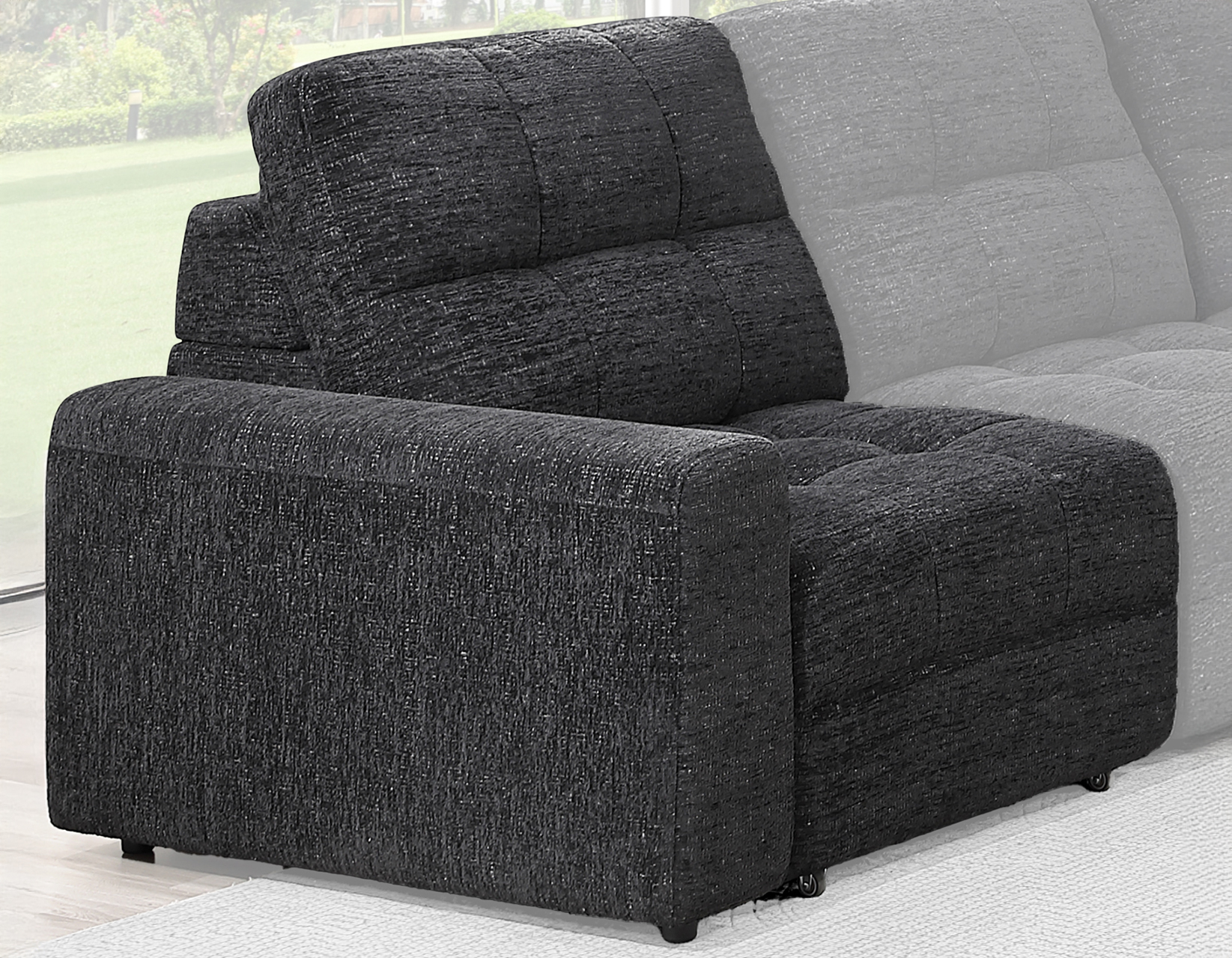 With one touch, the seat glides into a chaise for lounging or a twin bed for guests. Wrapped in a chic, durable black-peppered polyester, this modular piece adapts to your life. Pair it with an armless slider to instantly create a queen bed or a double chaise.