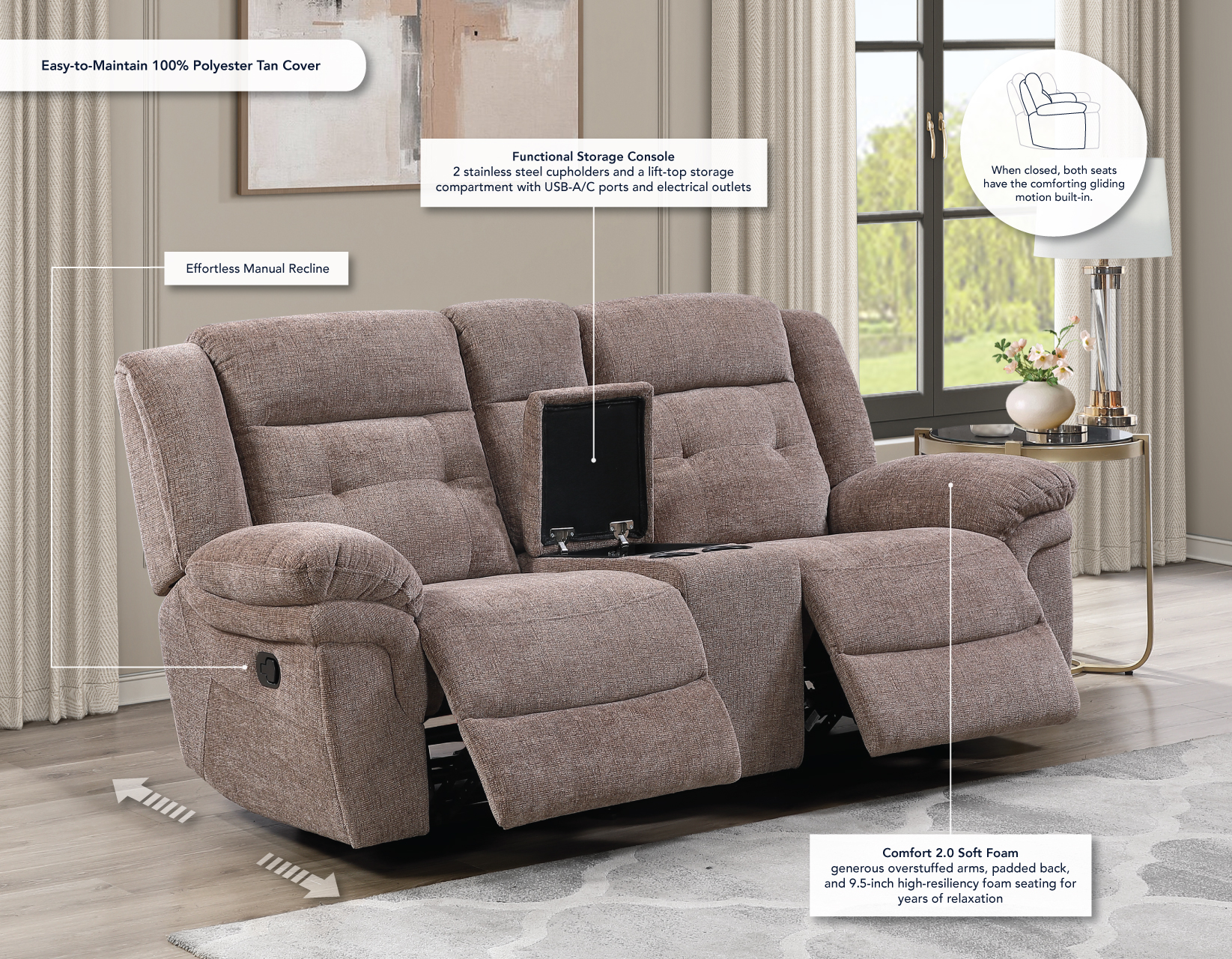 The Sydney Manual Reclining Console Loveseat delivers inviting comfort with clean, contemporary style designed for everyday living. A simple dimpled back offers a classic yet updated look, while soft, textured polyester upholstery in a warm neutral tone pairs beautifully with plush Comfort 2.0 foam, overstuffed arms, and supportive seating. Easy manual reclining lets you relax effortlessly, and the center lift-top storage console keeps remotes and electronics close at hand. Integrated USB charging, built-in cupholders, a durable steel seat foundation, and space-saving wall clearance make this loveseat as functional as it is comfortable.